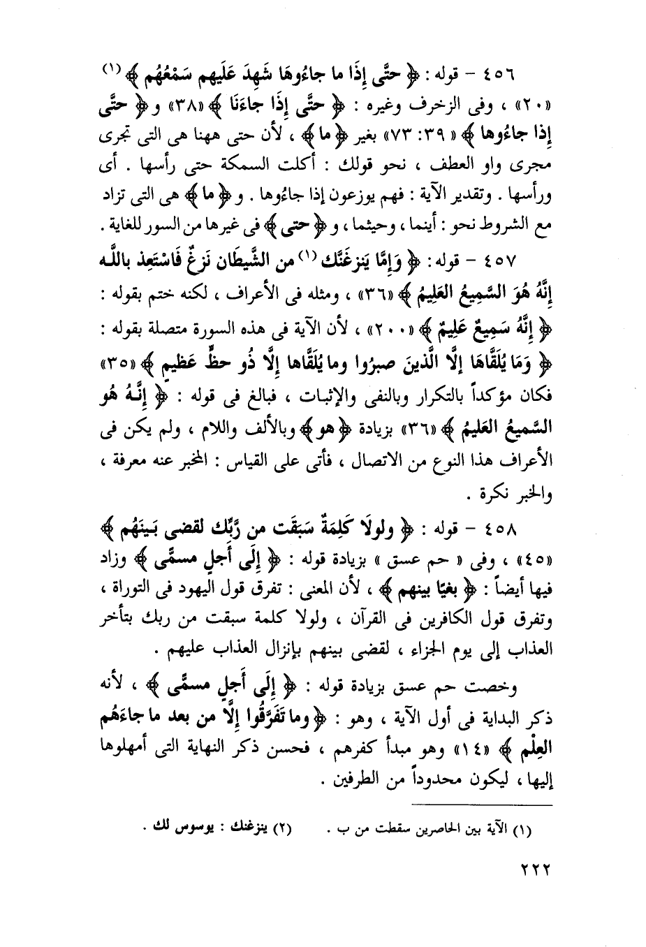 458 - قَوْله {وَإِمَّا يَنْزغَنك من الشَّيْطَان نَزغ فاستعذ بِاللَّه إِنَّه هُوَ السَّمِيع الْعَلِيم} وَمثله فِي الْأَعْرَاف لكنه ختم بقوله {إِنَّه سميع عليم} لِأَن الْآيَة فِي هَذِه السُّورَة مُتَّصِلَة بقوله {وَمَا يلقاها إِلَّا الَّذين صَبَرُوا وَمَا يلقاها إِلَّا ذُو حَظّ عَظِيم} فَكَانَ مؤكدا بالتكرار وبالنفي وَالْإِثْبَات فَبَالغ فِي قَوْله {إِنَّه هُوَ السَّمِيع الْعَلِيم} بِزِيَادَة {هُوَ} وبالألف وَاللَّام وَلم يكن فِي الْأَعْرَاف هَذَا النَّوْع من الِاتِّصَال فَأتى على الْقيَاس الْمخبر عَنهُ معرفَة وَالْخَبَر نكرَة