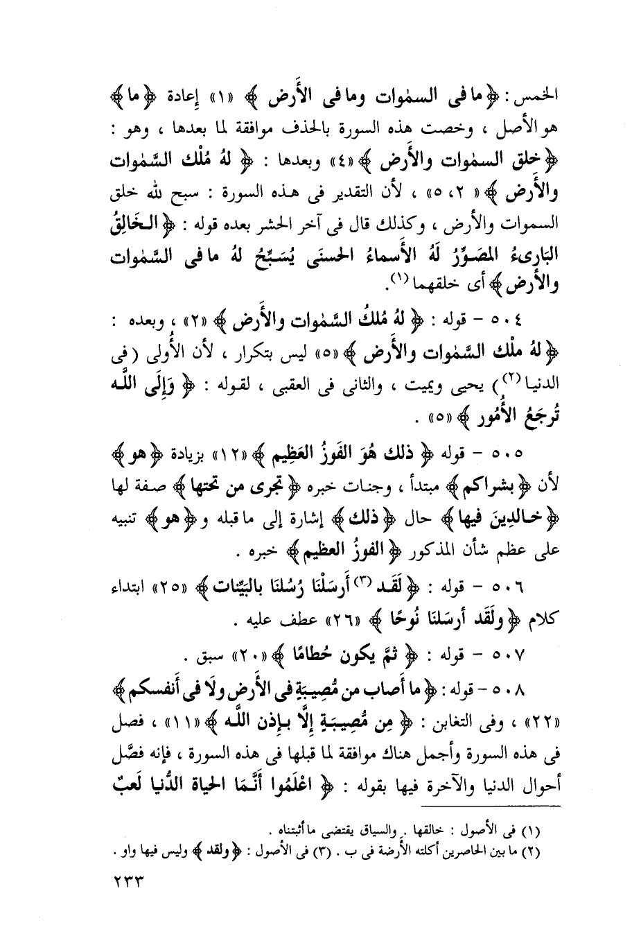 509 - قَوْله {مَا أصَاب من مُصِيبَة فِي الأَرْض وَلَا فِي أَنفسكُم} وَفِي التغابن {من مُصِيبَة إِلَّا بِإِذن الله} فصل فِي هَذِه السُّورَة وأجمل هُنَاكَ مُوَافقَة لما قبلهَا فِي هَذِه السُّورَة فَإِنَّهُ فصل أَحْوَال الدُّنْيَا وَالْآخِرَة فِيهَا بقوله {اعلموا أَنما الْحَيَاة الدُّنْيَا لعب