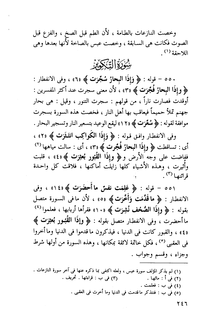 552 - قَوْله {علمت نفس مَا أحضرت} وَفِي الانفطار {مَا قدمت وأخرت} لِأَن مَا فِي هَذِه السُّورَة مُتَّصِل بقوله {وَإِذا الصُّحُف نشرت} فقرأها أَرْبَابهَا فَعَلمُوا مَا أحضرت وَفِي الانفطار مُتَّصِل بقوله {وَإِذا الْقُبُور بعثرت} والقبور كَانَت فِي الدُّنْيَا فَيذكرُونَ مَا قدمُوا فِي الدُّنْيَا وَمَا أخروا فِي العقبى فَكل خَاتِمَة لائقة بمكانها وَهَذِه السُّورَة من أَولهَا شَرط وَجَزَاء وَقسم وَجَوَاب