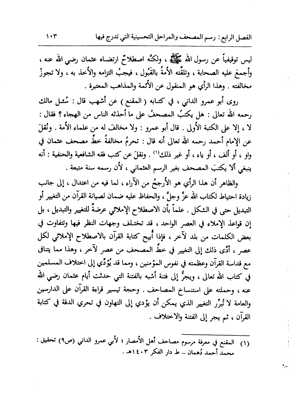 والظاهر أن هذا الرأي هو الأرجح من الآراء، لما فيه من اعتدال، إلى جانب زيادة احتياط لكتاب الله عزّ وجلّ، والحفاظ عليه ضمان لصيانة القرآن من التغيير أو التبديل حتى في الشكل. علما بأن الاصطلاح الإملائي عرضة للتغيير والتبديل، بل إن قواعد الإملاء في العصر الواحد، قد تختلف وجهات النظر فيها وتتفاوت في بعض الكلمات من بلد لآخر، فإذا أبيح كتابة القرآن بالاصطلاح الإملائي لكل عصر، أدّى ذلك إلى التغيير في خطّ المصحف من عصر لآخر، وهذا مما يتنافى مع قداسة القرآن وعظمته في نفوس المؤمنين، ومما قد يؤدّي إلى اختلاف المسلمين في كتاب الله تعالى، ويجرّ إلى فتنة أشبه بالفتنة التي حدثت أيام عثمان رضي الله عنه، وحملته على استنساخ المصاحف. وحجة تيسير قراءة القرآن على الدارسين والعامة لا تبرّر التغيير الذي يمكن أن يؤدي إلى التهاون في تحري الدقة في كتابة القرآن، ثم يجر إلى الفتنة والاختلاف.