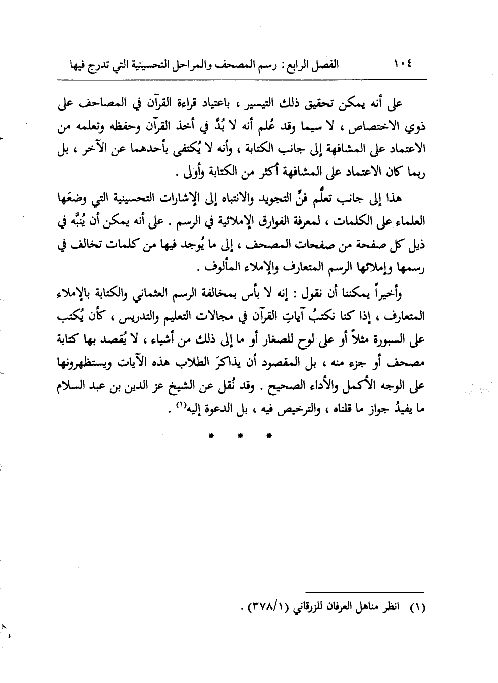وأخيرا يمكننا أن نقول: إنه لا بأس بمخالفة الرسم العثماني والكتابة بالإملاء المتعارف، إذا كنا نكتب آيات القرآن في مجالات التعليم والتدريس، كأن يكتب على السبورة مثلا أو على لوح للصغار أو ما إلى ذلك من أشياء، لا يقصد بها كتابة مصحف أو جزء منه، بل المقصود أن يذاكر الطلاب هذه الآيات ويستظهرونها على الوجه الأكمل والأداء الصحيح. وقد نقل عن الشيخ عز الدين بن عبد السلام ما يفيد جواز ما قلناه، والترخيص فيه، بل الدعوة إليه «1».