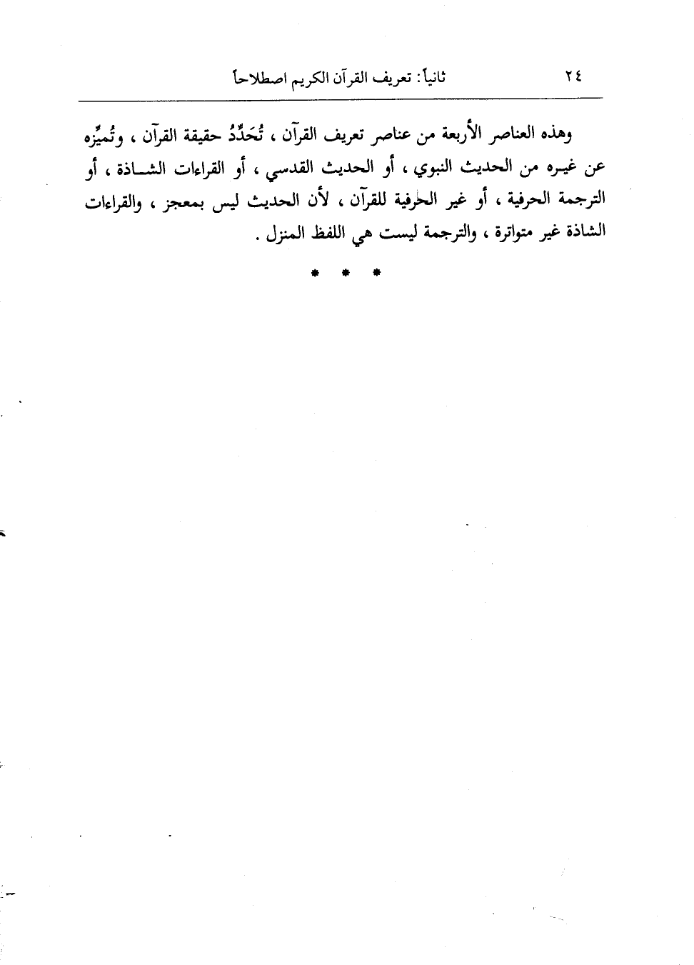 وهذه العناصر الأربعة من عناصر تعريف القرآن، تحدّد حقيقة القرآن، وتميّزه عن غيره من الحديث النبوي، أو الحديث القدسي، أو القراءات الشاذة، أو الترجمة الحرفية، أو غير الحرفية للقرآن، لأن الحديث ليس بمعجز، والقراءات الشاذة غير متواترة، والترجمة ليست هي اللفظ المنزل.