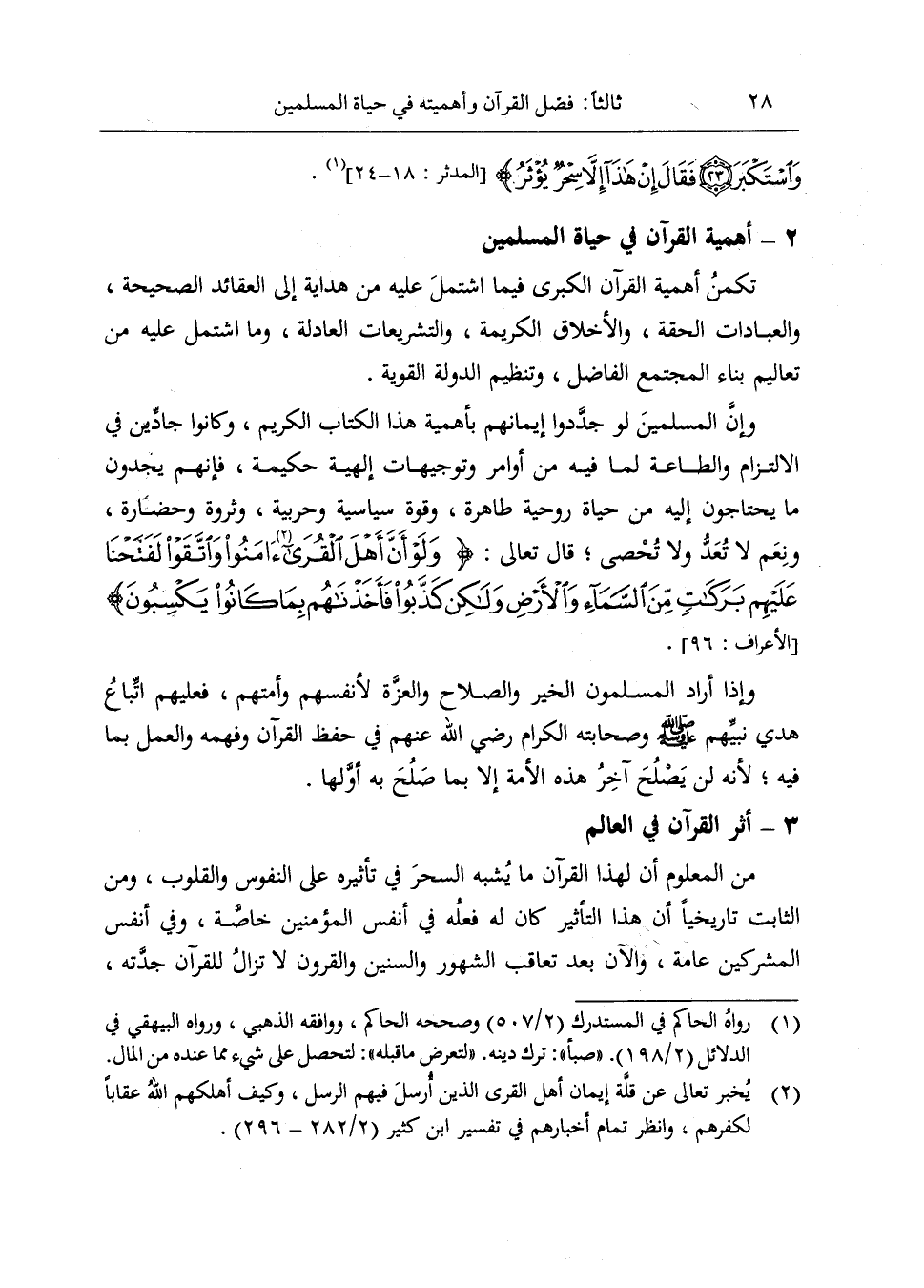 وإنّ المسلمين لو جدّدوا إيمانهم بأهمية هذا الكتاب الكريم، وكانوا جادّين في الالتزام والطاعة لما فيه من أوامر وتوجيهات إلهية حكيمة، فإنهم يجدون ما يحتاجون إليه من حياة روحية طاهرة، وقوة سياسية وحربية، وثروة وحضارة، ونعم لا تعدّ ولا تحصى؛ قال تعالى: وَلَوْ أَنَّ أَهْلَ الْقُرى «2» آمَنُوا وَاتَّقَوْا لَفَتَحْنا عَلَيْهِمْ بَرَكاتٍ مِنَ السَّماءِ وَالْأَرْضِ وَلكِنْ كَذَّبُوا فَأَخَذْناهُمْ بِما كانُوا يَكْسِبُونَ [الأعراف: 96].