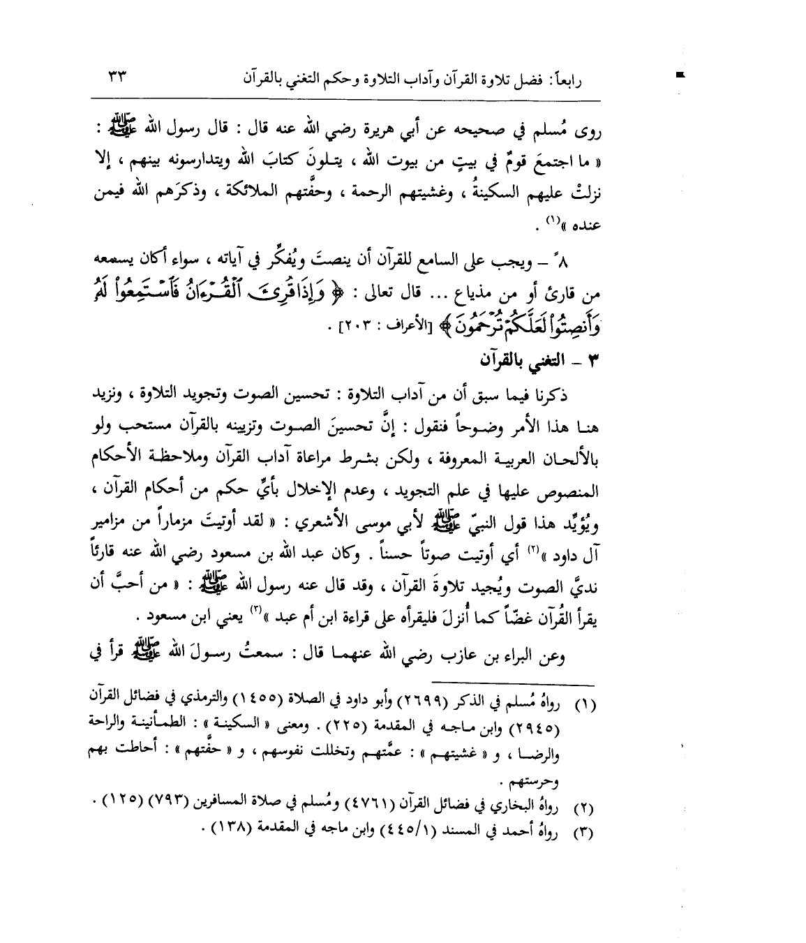 8 - ويجب على السامع للقرآن أن ينصت ويفكّر في آياته، سواء أكان يسمعه من قارئ أو من مذياع ... قال تعالى: وَإِذا قُرِئَ الْقُرْآنُ فَاسْتَمِعُوا لَهُ وَأَنْصِتُوا لَعَلَّكُمْ تُرْحَمُونَ [الأعراف: 203].