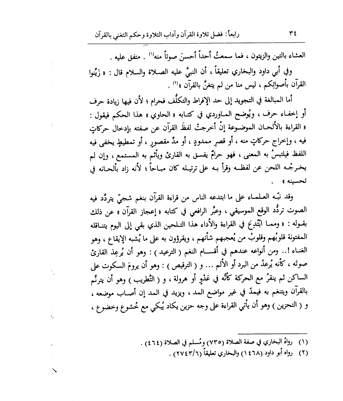 وفي أبي داود والبخاري تعليقا، أن النبيّ عليه الصلاة والسلام قال: «زيّنوا القرآن بأصواتكم، ليس منا من لم يتغنّ بالقرآن» «2».