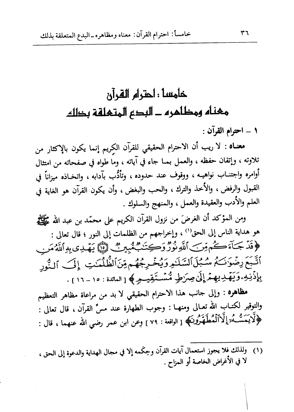 خامسا: احترام القرآن معناه ومظاهره- البدع المتعلقة بذلك