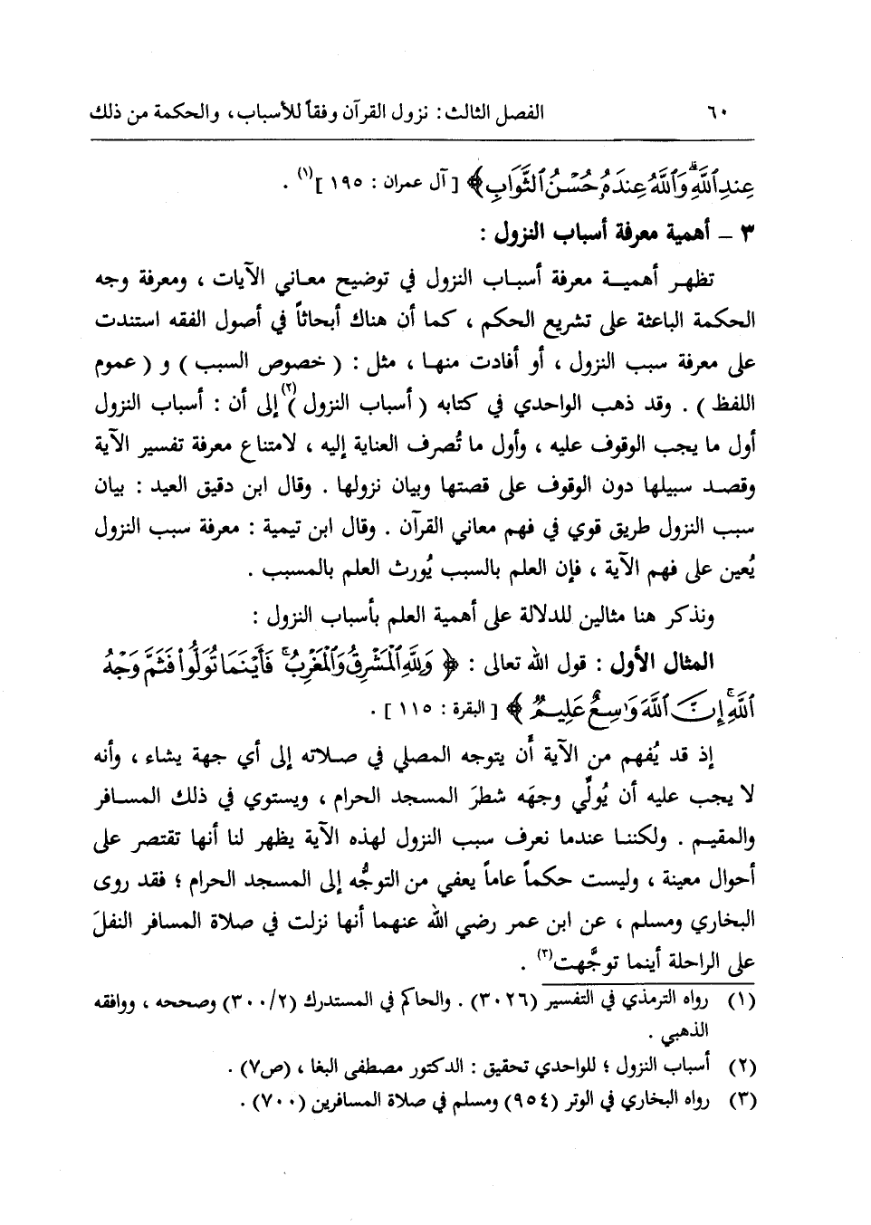 إذ قد يفهم من الآية أن يتوجه المصلي في صلاته إلى أي جهة يشاء، وأنه لا يجب عليه أن يولّي وجهه شطر المسجد الحرام، ويستوي في ذلك المسافر والمقيم. ولكننا عند ما نعرف سبب النزول لهذه الآية يظهر لنا أنها تقتصر على أحوال معينة، وليست حكما عاما يعفي من التوجّه إلى المسجد الحرام؛ فقد روى البخاري ومسلم، عن ابن عمر رضي الله عنهما أنها نزلت في صلاة المسافر النفل على الراحلة أينما توجّهت «3».