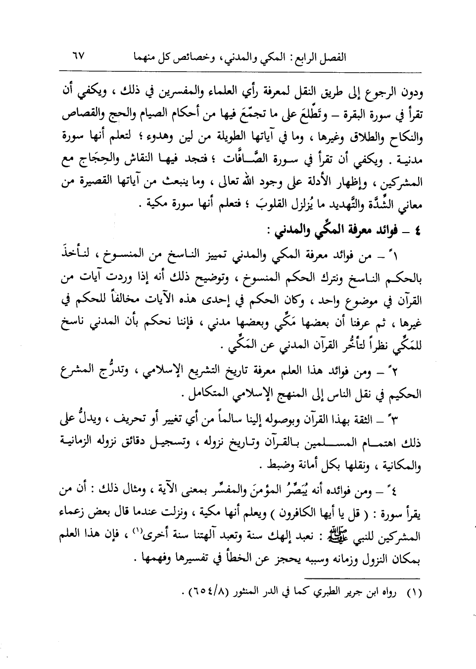 4 - ومن فوائده أنه يبصّر المؤمن والمفسّر بمعنى الآية، ومثال ذلك: أن من يقرأ سورة: (قل يا أيها الكافرون) ويعلم أنها مكية، ونزلت عند ما قال بعض زعماء المشركين للنبي صلّى الله عليه وسلّم: نعبد إلهك سنة وتعبد آلهتنا سنة أخرى «1»، فإن هذا العلم بمكان النزول وزمانه وسببه يحجز عن الخطأ في تفسيرها وفهمها.