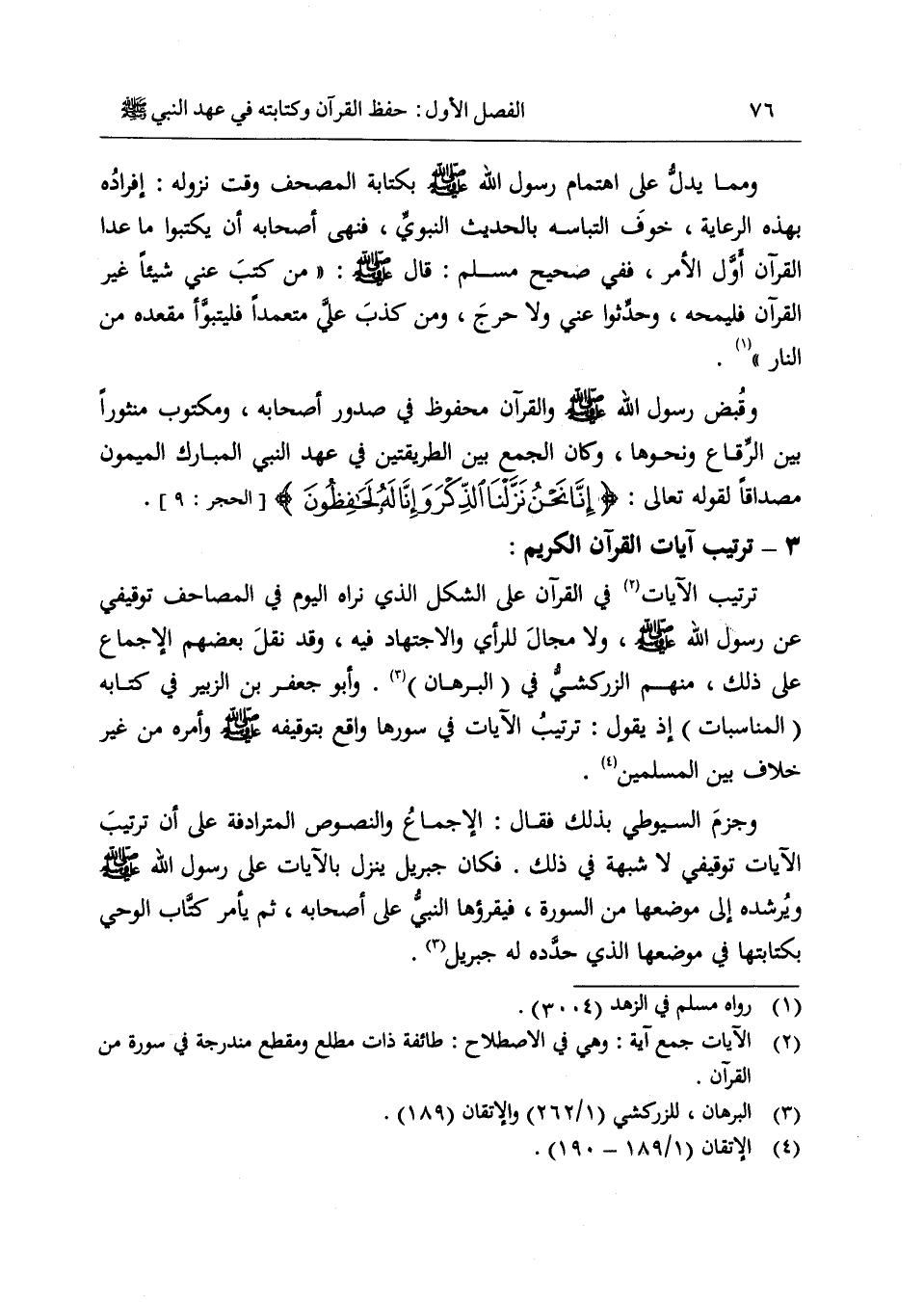 ومما يدلّ على اهتمام رسول الله صلّى الله عليه وسلّم بكتابة المصحف وقت نزوله: إفراده بهذه الرعاية، خوف التباسه بالحديث النبويّ، فنهى أصحابه أن يكتبوا ما عدا القرآن أوّل الأمر،