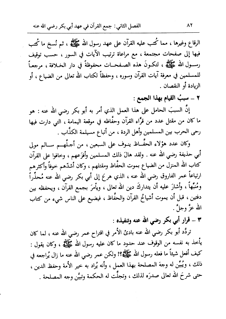 الرقاع وغيرها، مما كتب عليه القرآن على عهد رسول الله صلّى الله عليه وسلّم، ثم نسخ ما كتب فيها إلى صفحات مجتمعة، مع مراعاة ترتيب الآيات في السور، حسب توقيف رسول الله صلّى الله عليه وسلّم، لتكون هذه الصفحات محفوظة في دار الخلافة، مرجعا للمسلمين في معرفة آيات القرآن وسوره، وحفظا لكتاب الله تعالى من الضياع، أو الزيادة أو النقصان.