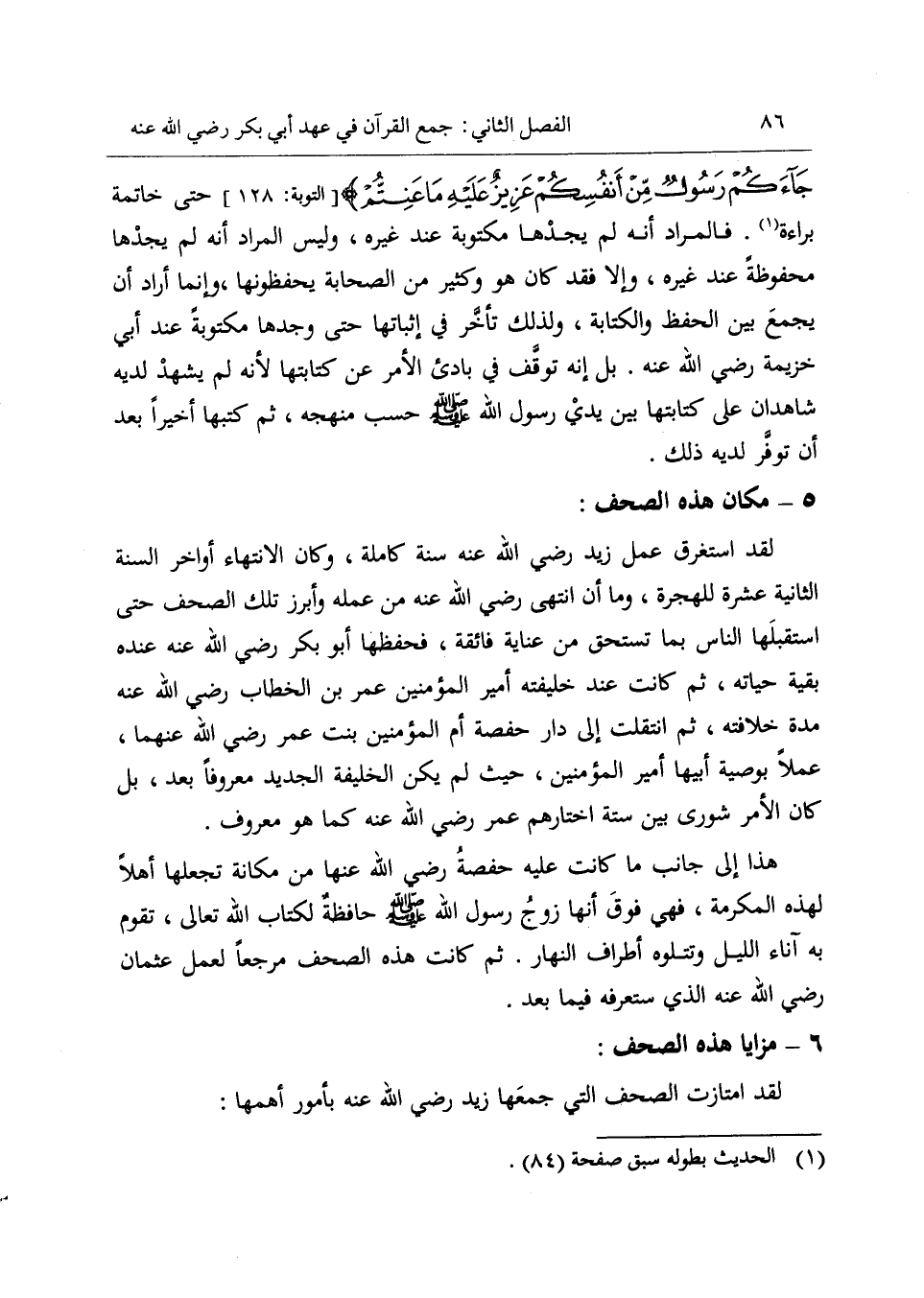 هذا إلى جانب ما كانت عليه حفصة رضي الله عنها من مكانة تجعلها أهلا لهذه المكرمة، فهي فوق أنها زوج رسول الله صلّى الله عليه وسلّم حافظة لكتاب الله تعالى، تقوم به آناء الليل وتتلوه أطراف النهار. ثم كانت هذه الصحف مرجعا لعمل عثمان رضي الله عنه الذي ستعرفه فيما بعد.