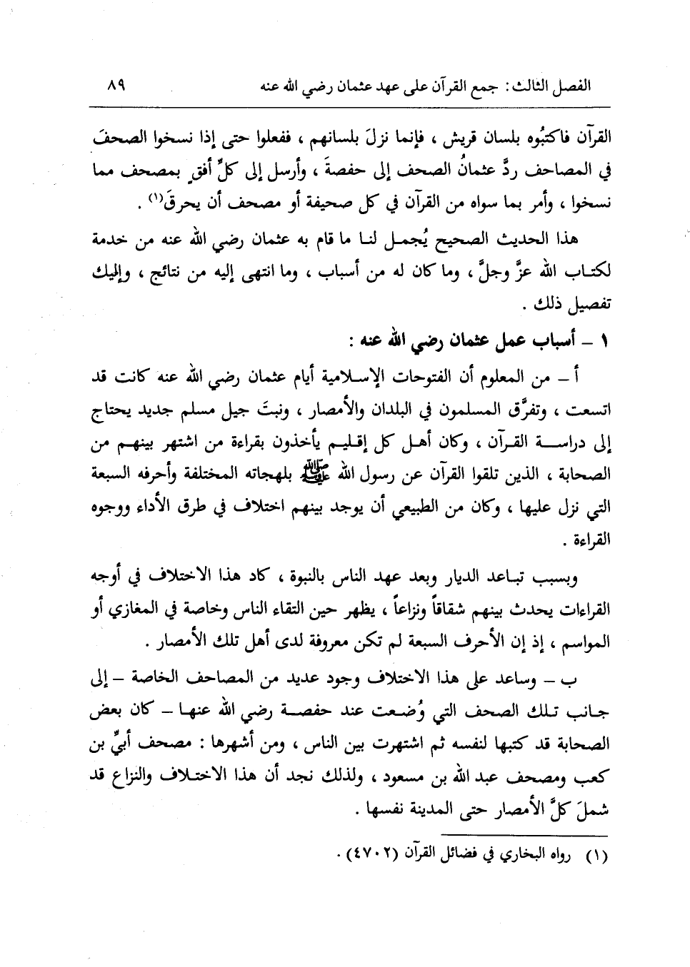 هذا الحديث الصحيح يجمل لنا ما قام به عثمان رضي الله عنه من خدمة لكتاب الله عزّ وجلّ، وما كان له من أسباب، وما انتهى إليه من نتائج، وإليك تفصيل ذلك.