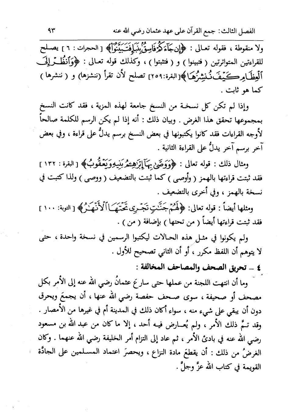 ولا منقوطة، فقوله تعالى: إِنْ جاءَكُمْ فاسِقٌ بِنَبَإٍ فَتَبَيَّنُوا [الحجرات: 6] يصلح للقراءتين المتواترتين (فتبينوا) و (فتثبتوا)، وكذلك قوله تعالى: وَانْظُرْ إِلَى الْعِظامِ كَيْفَ نُنْشِزُها [البقرة: 259] تصلح لأن تقرأ (ننشزها) و (ننشرها) كما هو ثابت.