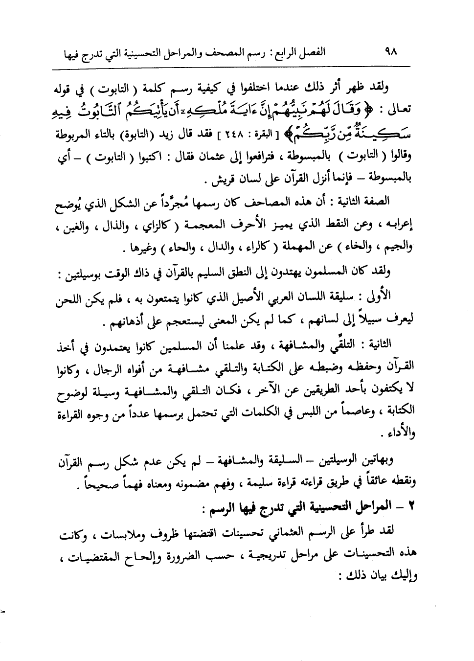 لقد طرأ على الرسم العثماني تحسينات اقتضتها ظروف وملابسات، وكانت هذه التحسينات على مراحل تدريجية، حسب الضرورة وإلحاح المقتضيات، وإليك بيان ذلك: