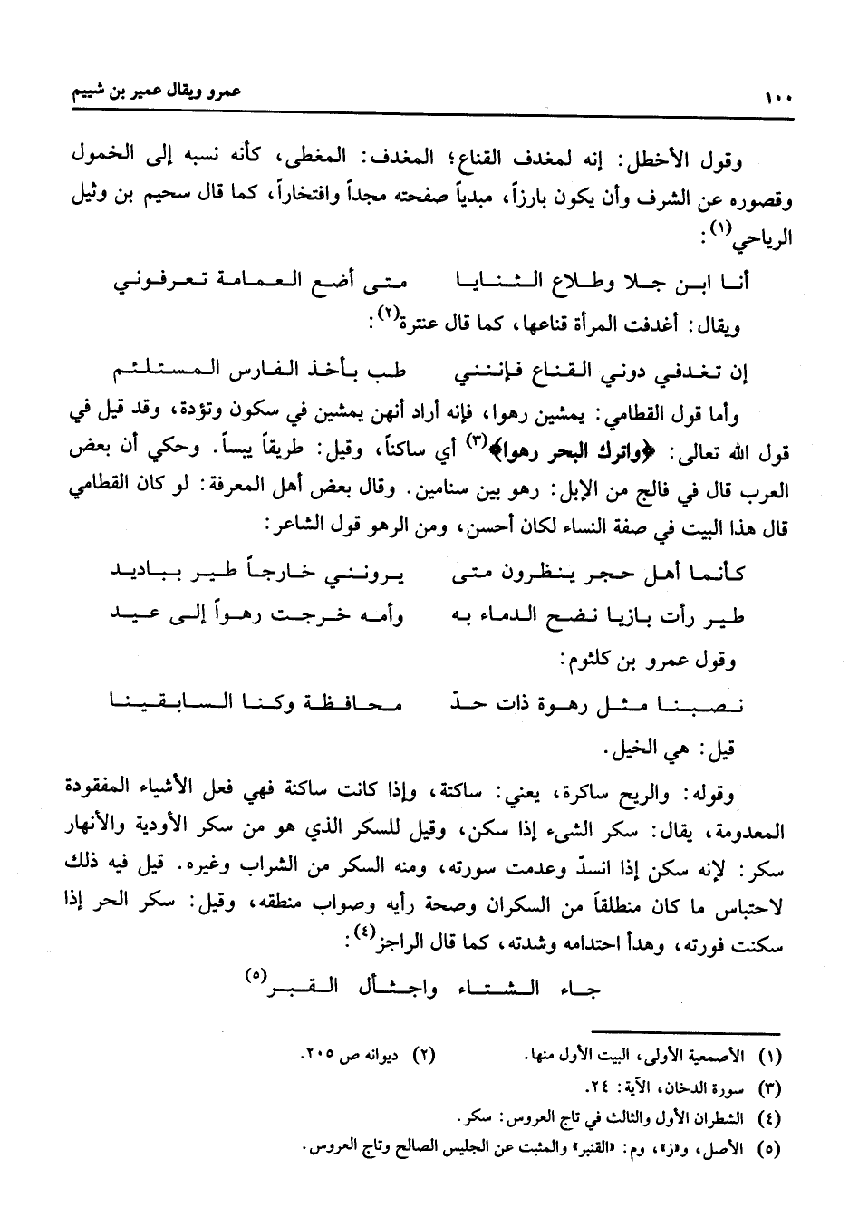 وقول الأخطل إنه لمغدف القناع المغدف المغطى كأنه نسبه إلى الخمول وقصوره عن الشرف وأن يكون بارزا مبديا صفحته مجدا وافتخارا كما قال سحيم بن وثيل الرياحي (1) أنا ابن جلا وطلاع الثنايا * متى أضع العمامة تعرفوني ويقال أغدفت المرأة قناعها كما قال عنترة (2) إن تغدفي دوني القناع فإنني * طب بأخذ الفارس المستلئم وأما قول القطامي يمشين رهوا فإنه أراد أنهن يمشين في سكون وتؤدة وقد قيل في قول الله تعالى " واترك البحر رهوا " (3) أي ساكنا وقيل طريقا يبسا وحكي أن بعض العرب قال في فالج من الإبل رهو بين سنامين وقال بعض أهل المعرفة لو كان القطامي قال هذا البيت في صفة النساء لكان أحسن ومن الرهو قول الشاعر * كأنما أهل حجر ينظرون متى * يرونني خارجا طير بباديد طير رأت بازيا نضح الدماء به * وأمه خرجت رهوا إلى عيد وقول عمرو بن كلثوم * نصبنا مثل رهوة ذات حد * محافظة وكنا السابقينا قيل هي الخيل وقوله والريح ساكرة يعني ساكتة وإذا كانت ساكنة فهي فعل الأشياء المفقودة المعدومة يقال سكر الشئ إذا سكن وقيل للسكر الذي هو من سكر الأودية والأنهار سكر لإنه سكن إذا انسد وعدمت سورته ومنه السكر من الشراب وغيره قيل فيه ذلك لاحتباس ما كان منطلقا من السكران وصحة رأيه وصواب منطقه وقيل سكر الحر إذا سكنت فورته وهدأ احتدامه وشدته كما قال الراجز (4) جاء الشتاء واجثأل القبر (5) *