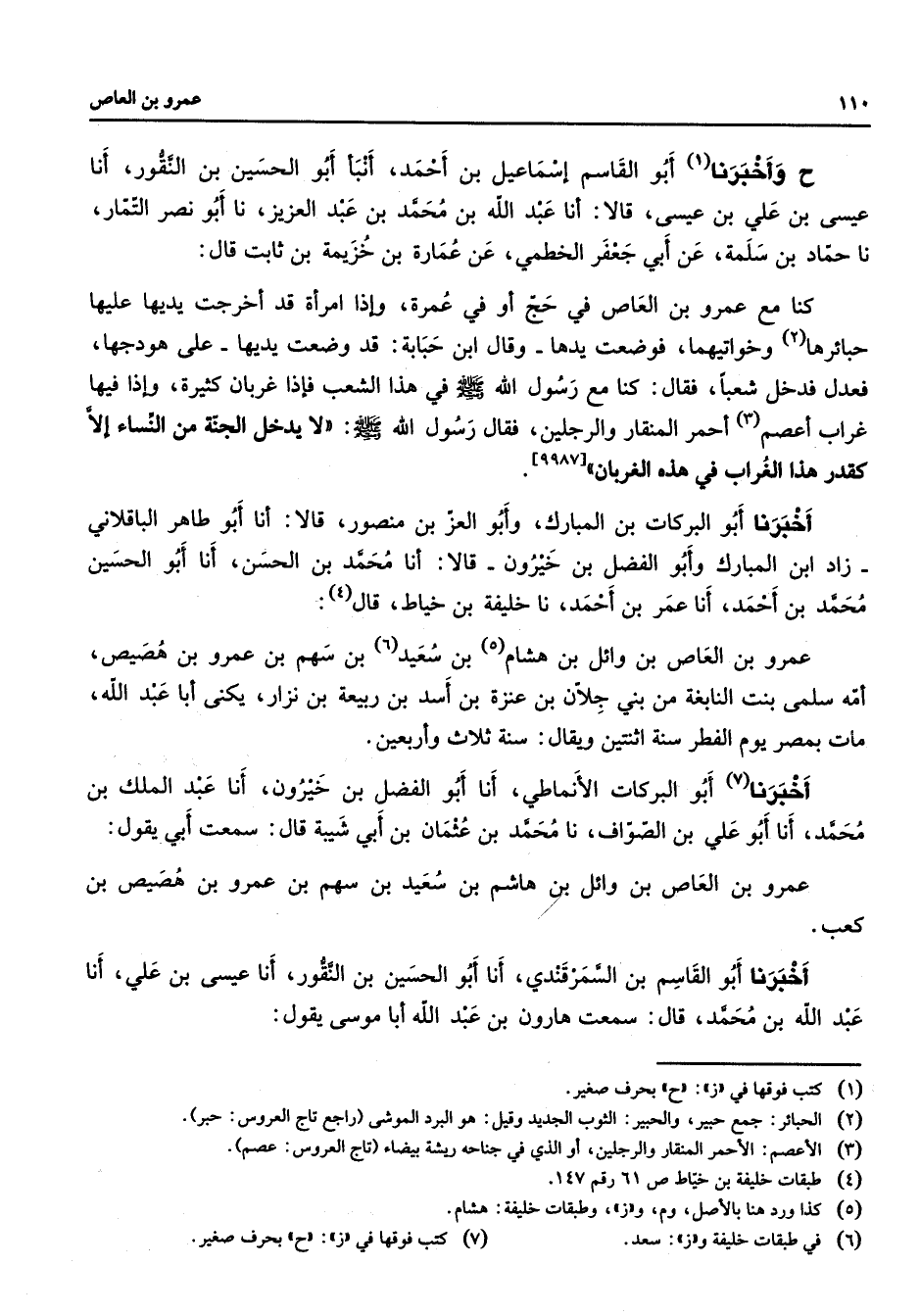 [9987] أخبرنا أبو البركات بن المبارك وأبو العز بن منصور قالا أنا أبو طاهر الباقلاني زاد ابن المبارك وأبو الفضل بن خيرون قالا أنا محمد بن الحسن أنا أبو الحسين محمد بن أحمد أنا عمر بن أحمد نا خليفة بن خياط قال (4) عمرو بن العاص بن وائل بن هشام (5) بن سعيد (6) بن سهم بن عمرو بن هصيص أمه سلمى بنت النابغة من بني جلان بن عنزة بن أسد بن ربيعة بن نزار يكنى أبا عبد الله مات بمصر يوم الفطر سنة اثنتين ويقال سنة ثلاث وأربعين أخبرنا (7) أبو البركات الأنماطي أنا أبو الفضل بن خيرون أنا عبد الملك بن محمد أنا أبو علي بن الصواف نا محمد بن عثمان بن أبي شيبة قال سمعت أبي يقول عمرو بن العاص بن وائل بن هاشم بن سعيد بن سهم بن عمرو بن هصيص بن كعب أخبرنا أبو القاسم بن السمرقندي أنا أبو الحسين بن النقور أنا عيسى بن علي أنا عبد الله بن محمد قال سمعت هارون بن عبد الله أبا موسى يقول