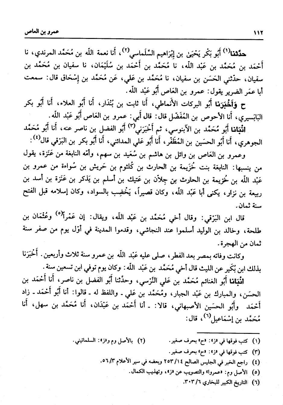 حدثنا أبو بكر يحيى بن إبراهيم السلماسي (2) أنا نعمة الله بن محمد المرندي نا أحمد بن محمد بن عبد الله نا محمد بن أحمد بن سليمان نا سفيان بن محمد بن سفيان حدثني الحسن بن سفيان نا محمد بن علي عن محمد بن إسحاق قال سمعت أبا عمر الضرير يقول عمرو بن العاص أبو عبد الله ح وأخبرنا أبو البركات الأنماطي أنا ثابت بن بندار أنا أبو العلاء أنا أبو بكر البابسيري أنا الأحوص بن المفضل قال قال أبي عمرو بن العاص أبو عبد الله أنبأنا أبو محمد بن الآبنوسي ثم أخبرني (3) أبو الفضل بن ناصر عنه أنا أبو محمد الجوهري أنا أبو الحسين بن المظفر أنا أبو علي المدائني أنا أبو بكر بن البرقي قال (4) وعمرو بن العاص بن وائل بن هاشم بن سعيد بن سهم وأمه النابغة من عنزة يقول من ينسبها النابغة بنت خزيمة بن الحارث بن كلثوم بن حريش بن سواءة من عمرو بن عبد الله بن خزيمة بن الحارث بن جلان بن عتيك بن أسلم بن يذكر بن عنزة بن أسد بن ربيعة بن نزار يكنى أبا عبد الله وكان قصيرا يخضب بالسواد وكان إسلامه قبل الفتح سنة ثمان قال ابن البرقي وقال أخي محمد بن عبد الله ويقال إن عمرا (5) وعثمان بن طلحة وخالد بن الوليد أسلموا عند النجاشي وقدموا المدينة في أول يوم من صفر سنة ثمان من الهجرة وكانت وفاته بمصر بعد الفطر صلى عليه عبد الله بن عمرو سنة ثلاث وأربعين أخبرنا بذلك ابن بكير عن الليث قال أخي محمد بن عبد الله وكان يوم توفي ابن تسعين سنة أنبأنا أبو الغنائم محمد بن علي النرسي وحدثنا أبو الفضل بن ناصر أنا أحمد بن الحسن والمبارك بن عبد الجبار ومحمد بن علي واللفظ له قالوا أنا أبو أحمد زاد أحمد وأبو الحسين الأصبهاني قالا أنا أحمد بن عبدان أنا محمد بن سهل أنا محمد بن إسماعيل (6) قال