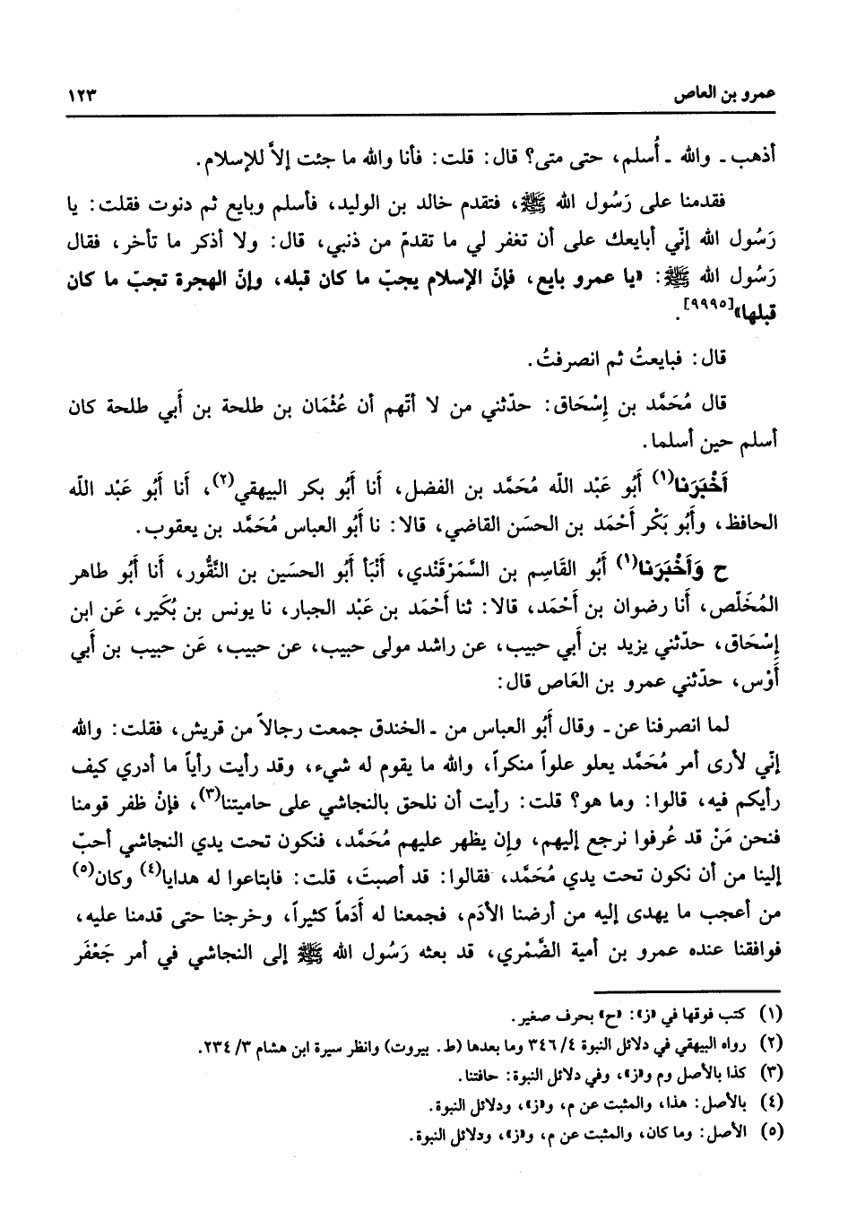 أذهب والله أسلم حتى متى قال قلت فأنا والله ما جئت إلا للإسلام فقدمنا على رسول الله (صلى الله عليه وسلم) فتقدم خالد بن الوليد فأسلم وبايع ثم دنوت فقلت يا رسول الله إني أبايعك على أن تغفر لي ما تقدم من ذنبي قال ولا أذكر ما تأخر فقال رسول الله (صلى الله عليه وسلم) يا عمرو بايع فإن الإسلام يجب ما كان قبله وإن الهجرة تجب ما كان قبلها