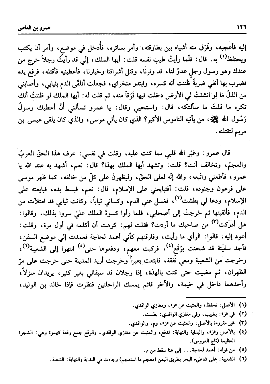 إليه فأعجبه وفرق منه أشياء بين بطارقته وأمر بسائره فأدخل في موضع وأمر أن يكتب ويحتفظ (1) به قال فلما رأيت طيب نفسه قلت أيها الملك إني قد رأيت رجلا خرج من عندك وهو رسول رجل عدو لنا قد وترنا وقتل أشرافنا وخيارنا فأعطينيه فأقتله فرفع يده فضرب بها أنفي ضربة ظننت أنه كسره وابتدر منخراي فجعلت أتلقى الدم بثيابي وأصابني من الذل ما لو انشقت لي الأرض دخلت فيها فرقا منه ثم قلت له أيها الملك لو ظننت أنك تكره ما قلت ما سألتكه قال واستحيي وقال يا عمرو تسألني أن أعطيك رسول رسول الله (صلى الله عليه وسلم) من يأتيه الناموس الأكبر الذي كان يأتي موسى والذي كان يلقى عيسى بن مريم لتقتلنه قال عمرو وغير الله قلبي مما كنت عليه وقلت في نفسي عرف هذا الحق العرب والعجم وتخالف أنت قلت وتشهد أيها الملك بهذا قال نعم أشهد به عند الله يا عمرو فأطعني واتبعه والله إنه لعلى الحق وليظهرن على كل من خالفه كما ظهر موسى على فرعون وجنوده قلت أفتبايعني على الإسلام قال نعم فبسط يده فبايعته على الإسلام ودعا لي بطشت (2) فغسل عني الدم وكساني ثيابا وكانت ثيابي قد امتلأت من الدم فألقيتها ثم خرجت إلى أصحابي فلما رأوا كسوة الملك علي سروا بذلك وقالوا هل أدركت (3) من صاحبك ما أردت فقلت لهم كرهت أن أكلمه في أول مرة وقلت أعود إليه قالوا الرأي ما رأيت وفارقتهم كأني أعمد لحاجة فعمدت إلي موضع السفن فأجد سفينة قد شحنت برقع (4) فركبت معهم ودفعوها حتى (5) انتهوا إلى الشعبية (6) وخرجت من الشعيبة ومعي نفقة فابتعت بعيرا وخرجت أريد المدينة حتى خرجت على مر الظهران ثم مضيت حتى كنت بالهدة إذا رجلان قد سبقاني بغير كثير يريدان منزلا وأحدهما داخل في خيمة والآخر قائم يمسك الراحلتين فنظرت فإذا خالد بن الوليد