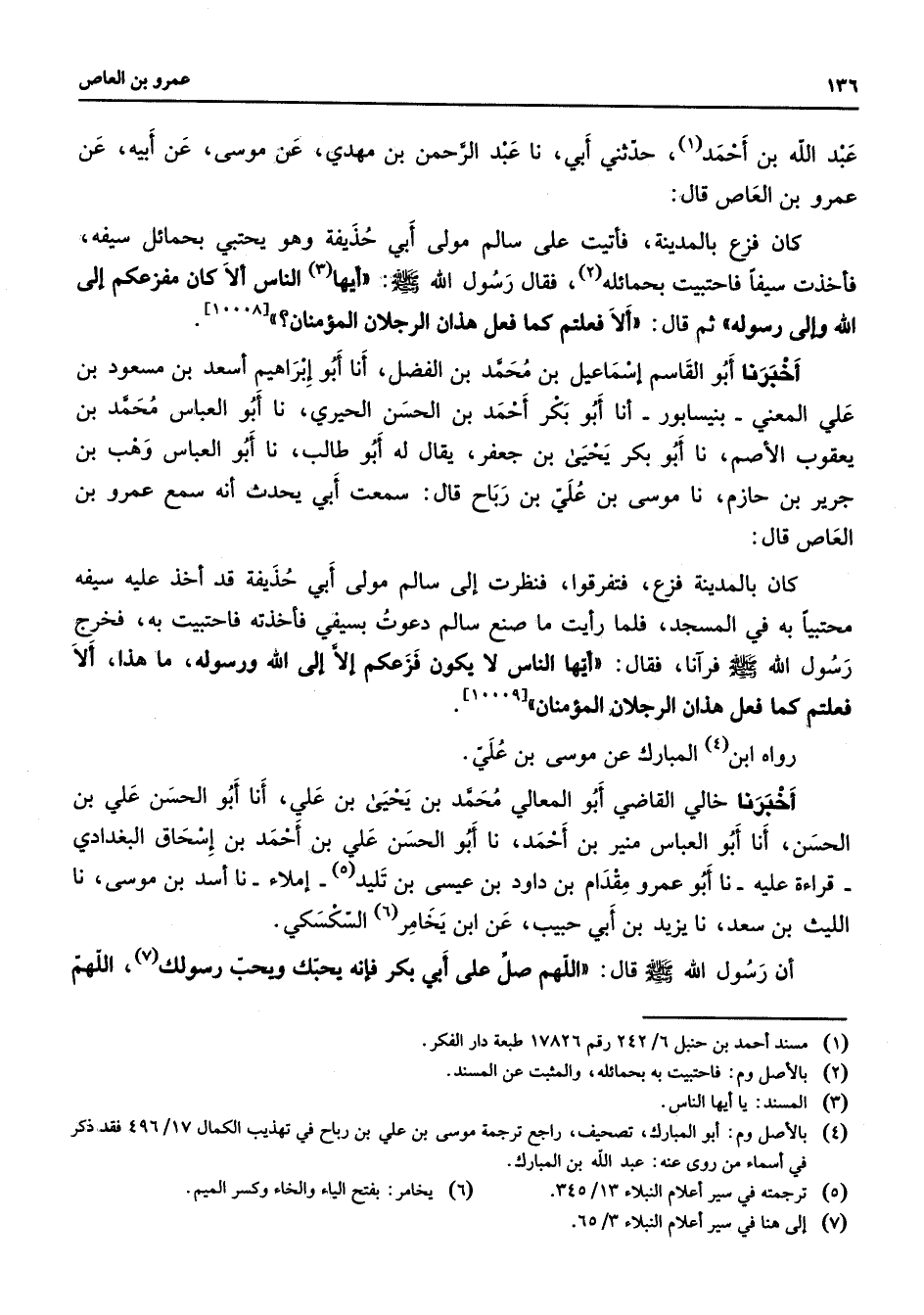 عبد الله بن أحمد (1) حدثني أبي نا عبد الرحمن بن مهدي عن موسى عن أبيه عن عمرو بن العاص قال كان فزع بالمدينة فأتيت على سالم مولى أبي حذيفة وهو يحتبي بحمائل سيفه فأخذت سيفا فاحتبيت بحمائله (2) فقال رسول الله (صلى الله عليه وسلم) أيها (3) الناس ألا كان مفزعكم إلى الله وإلى رسوله ثم قال ألا فعلتم كما فعل هذان الرجلان المؤمنان