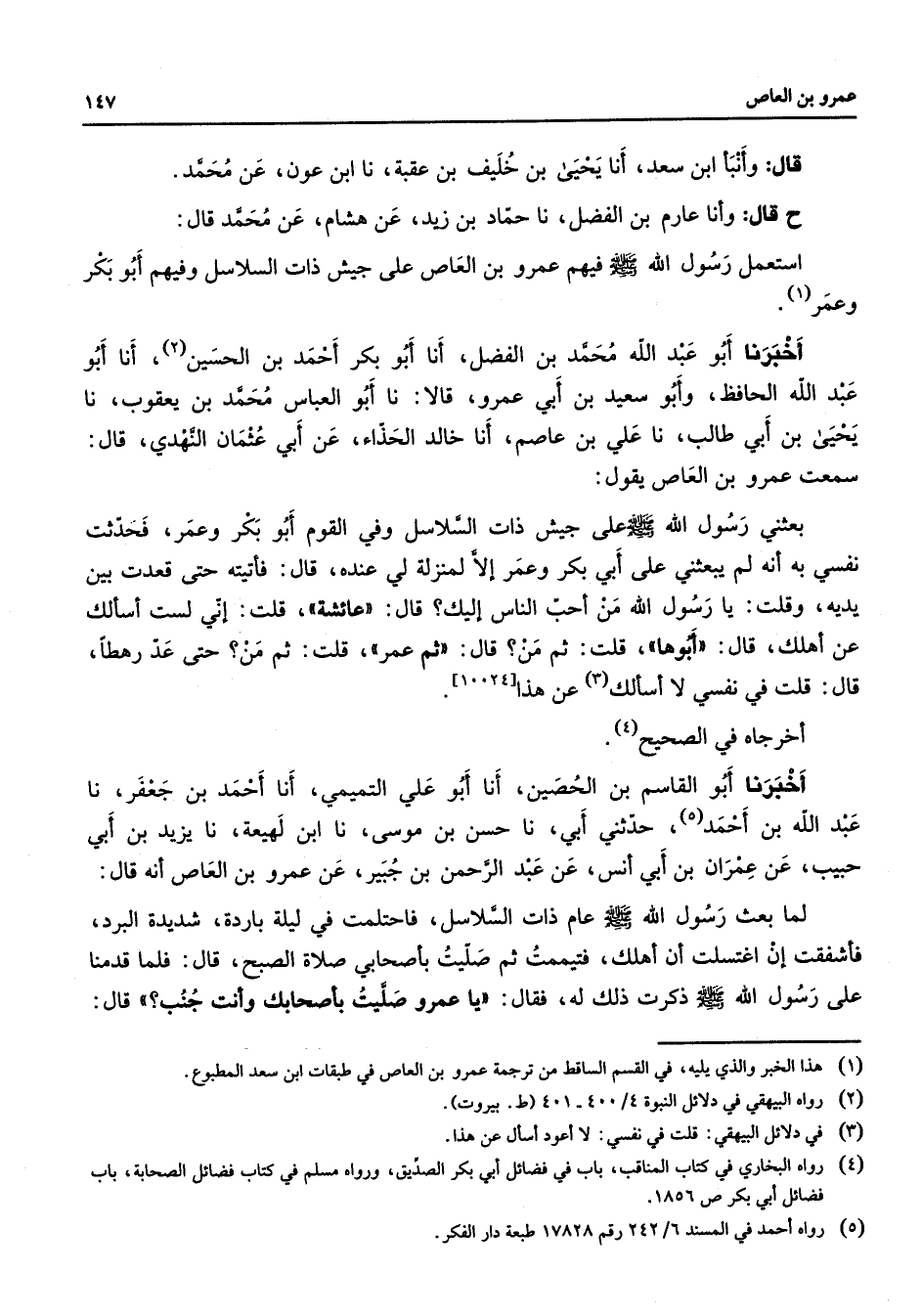 قال وأنبأ ابن سعد أنا يحيى بن خليف بن عقبة نا ابن عون عن محمد ح قال وأنا عارم بن الفضل نا حماد بن زيد عن هشام عن محمد قال استعمل رسول الله (صلى الله عليه وسلم) فيهم عمرو بن العاص على جيش ذات السلاسل وفيهم أبو بكر وعمر (1) أخبرنا أبو عبد الله محمد بن الفضل أنا أبو بكر أحمد بن الحسين (2) أنا أبو عبد الله الحافظ وأبو سعيد بن أبي عمرو قالا نا أبو العباس محمد بن يعقوب نا يحيى بن أبي طالب نا علي بن عاصم أنا خالد الحذاء عن أبي عثمان النهدي قال سمعت عمرو بن العاص يقول بعثني رسول الله (صلى الله عليه وسلم) على جيش ذات السلاسل وفي القوم أبو بكر وعمر فحدثت نفسي به أنه لم يبعثني على أبي بكر وعمر إلا لمنزلة لي عنده قال فأتيته حتى قعدت بين يديه وقلت يا رسول الله من أحب الناس إليك قال عائشة قلت إني لست أسألك عن أهلك قال أبوها قلت ثم من قال ثم عمر قلت ثم من حتى عد رهطا قال قلت في نفسي لا أسألك (3) عن هذا