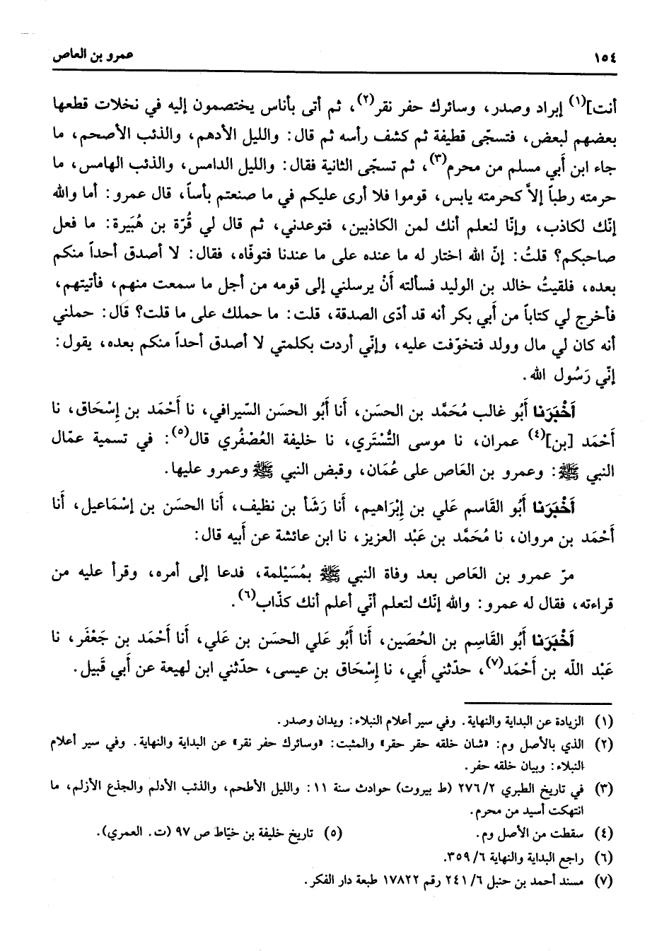 أنت (1) إبراد وصدر وسائرك حفر نقر (2) ثم أتى بأناس يختصمون إليه في نخلات قطعها بعضهم لبعض فتسجى قطيفة ثم كشف رأسه ثم قال والليل الأدهم والذئب الأصحم ما جاء ابن أبي مسلم من محرم (3) ثم تسجى الثانية فقال والليل الدامس والذئب الهامس ما حرمته رطبا إلا كحرمته يابس قوموا فلا أرى عليكم في ما صنعتم بأسا قال عمرو أما والله إنك لكاذب وإنا لنعلم أنك لمن الكاذبين فتوعدني ثم قال لي قرة بن هبيرة ما فعل صاحبكم قلت إن الله اختار له ما عنده على ما عندنا فتوفاه فقال لا أصدق أحدا منكم بعده فلقيت خالد بن الوليد فسألته أن يرسلني إلى قومه من أجل ما سمعت منهم فأتيتهم فأخرج لي كتابا من أبي بكر أنه قد أدى الصدقة قلت ما حملك على ما قلت قال حملني أنه كان لي مال وولد فتخوفت عليه وإني أردت بكلمتي لا أصدق أحدا منكم بعده يقول إني رسول الله أخبرنا أبو غالب محمد بن الحسن أنا أبو الحسين السيرافي نا أحمد بن إسحاق نا أحمد بن (4) عمران نا موسى التستري نا خليفة العصفري قال (5) في تسمية عمال النبي (صلى الله عليه وسلم) وعمرو بن العاص على عمان وقبض النبي (صلى الله عليه وسلم) وعمرو عليها أخبرنا أبو القاسم علي بن إبراهيم أنا رشأ بن نظيف أنا الحسن بن إسماعيل أنا أحمد بن مروان نا محمد بن عبد العزيز نا ابن عائشة عن أبيه قال مر عمرو بن العاص بعد وفاة النبي (صلى الله عليه وسلم) بمسيلمة فدعا إلى أمره وقرأ عليه من قراءته فقال عمرو والله إنك لتعلم أني أعلم أنك كذاب (6) أخبرنا أبو القاسم بن الحصين أنا أبو علي الحسن بن علي أنا أحمد بن جعفر نا عبد الله بن أحمد (7) حدثني أبي نا إسحاق بن عيسى حدثني ابن لهيعة عن أبي قبيل