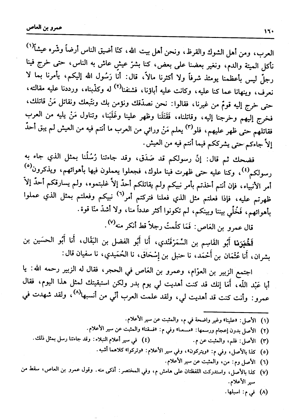العرب ومن أهل الشوك والقرظ ونحن أهل بيت الله كنا أضيق الناس أرضا وشره عيشا (1) نأكل الميتة والدم ونغير بعضنا على بعض كنا بشر عيش عاش به الناس حتى خرج فينا رجل ليس بأعظمنا يومئذ شرفا ولا أكثرنا مالا قال أنا رسول الله إليكم يأمرنا بما لا نعرف وينهانا عما كنا عليه وكانت عليه أباؤنا فشنفنا (2) له وكذبناه ورددنا عليه مقالته حتى خرج إليه قوم من غيرنا فقالوا نحن نصدقك ونؤمن بك ونتبعك ونقاتل من قاتلك فخرج إليه وخرجنا إليه وقاتلناه فقتلنا وظهر علينا وغلبنا وتناول من يليه من العرب فقاتلهم حتى ظهر عليهم فلو (3) يعلم من ورائي من العرب ما انتم فيه من العيش لم يبق أحد إلا جاءكم حتى يشرككم فيما أنتم فيه من العيش فضحك ثم قال إن رسولكم قد صدق وقد جاءتنا رسلنا بمثل الذي جاء به رسولكم (4) وكنا عليه حتى ظهرت فينا ملوك فجعلوا يعملون فيها بأهوائهم ويذكرون (5) أمر الأنبياء فإن أنتم أخذتم بأمر نبيكم ولم يقاتلكم أحد إلا غلبتموه ولم يسارقكم أحد إلا ظهرتم عليه فإذا فعلتم مثل الذي فعلنا فتركتم أمر (6) نبيكم وفعلتم بمثل الذي عملوا بأهوائهم فخلي بيننا وبينكم لم تكونوا أكثر عددا منا ولا أشد منا قوة قال عمرو بن العاص فما كلمت رجلا قط أنكر منه (7) أخبرنا أبو القاسم بن السمرقندي أنا أبو الفضل بن البقال أنا أبو الحسين بن بشران أنا عثمان بن أحمد نا حنبل بن إسحاق نا الحميدي نا سفيان قال اجتمع الزبير بن العوام وعمرو بن العاص في الحجر فقال له الزبير رحمه الله يا أبا عبد الله أما إنك قد كنت أهديت لي يوم بدر ولكن استبقيتك لمثل هذا اليوم فقال عمرو وأنت كنت قد أهديت لي ولقد علمت العرب أني من أنسبها (8) ولقد شهدت في