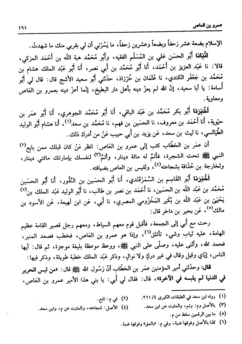 الإسلام بضعة عشر زحفا وبضعا وعشرين زحفا ما يسرني أن لي بقربي منك ما شهدت أنبأنا أبو الحسن علي بن المسلم الفقيه وأبو محمد هبة الله بن أحمد المزكي قالا نا عبد العزيز بن أحمد أنا أبو محمد بن أبي نصر أنا أبو عبد الملك هشام بن محمد بن جعفر الكندي نا عثمان بن خرزاذ حدثني أبو سعيد الأشج قال قال لي أبو أسامة يا أبا سعيد إن الله لم يعز دينه بأهل دار البطيخ إنما أعز دينه بعمرو بن العاص ومعاوية أخبرنا أبو بكر محمد بن عبد الباقي أنا أبو محمد الجوهري أنا أبو عمر بن حيوية أنا أحمد بن معروف نا الحسين بن فهم نا محمد بن سعد (1) أنا هشام أبو الوليد الطيالسي نا ليث بن سعد عن يزيد بن أبي حبيب عن من أدرك ذلك أن عمر بن الخطاب كتب إلى عمرو بن العاص انظر من كان قبلك ممن بايع (2) النبي (صلى الله عليه وسلم) تحت الشجرة فأتم له مائة دينار وأتم (3) لنفسك بإمارتك مائتي دينار ولخارجة بن حذافة بشجاعته (4) ولقيس بن العاص بضيافته أخبرنا أبو القاسم بن السمرقندي أنا أبو الحسين بن النقور أنا أبو الحسين محمد بن عبد الله بن الحسين نا أحمد بن نصر بن طالب نا أبو الوليد عبد الملك بن (5) يحيى بن عبد الله بن بكير المخزومي المصري نا أبي عن ابن لهيعة عن الأسود بن مالك (5) عن بحير بن داخر قال رحت مع أبي إلى الجمعة فأقبل قوم معهم السياط ومعهم رجل قصير القامة عظيم الهامة عليه ثياب وشئ تأتلق (6) وإذا هو عمرو بن العاص فخطب فصعد المنبر فحمد الله وأثنى عليه وصلى على النبي (صلى الله عليه وسلم) ووعظ موعظة بليغة موجزة ثم قال أيها الناس إياي وقيل وقال في غير درك ولا نوال وذكر عبد الملك خطبة طويلة وذكر فيها قال وحدثني أمير المؤمنين عمر بن الخطاب أن رسول الله (صلى الله عليه وسلم) قال من لبس الحرير في الدنيا لم يلبسه في الآخرة قال فقال لي أبي يا بني هذا الأمير عمرو بن العاص
