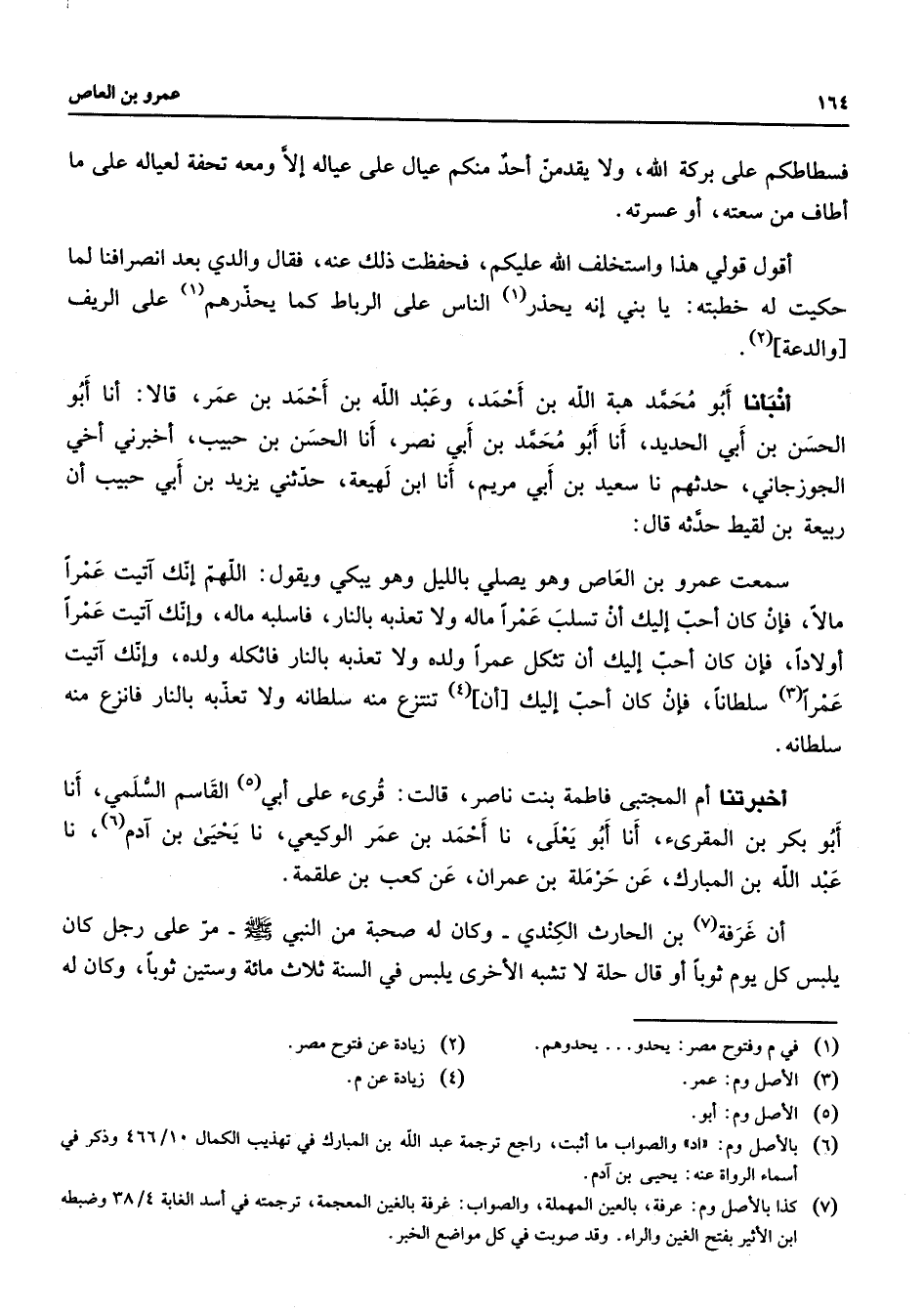 فسطاطكم على بركة الله ولا يقدمن أحد منكم عيال على عياله إلا ومعه تحفة لعياليه على ما أطاف من سعته أو عسرته أقول قولي هذا واستخلف الله عليكم فحفظت ذلك عنه فقال والدي بعد انصرافنا لما حكيت له خطبته يا بني إنه يحذر (1) الناس على الرباط كما يحذرهم (1) على الريف والدعة (2) أنبأنا أبو محمد هبة الله بن أحمد وعبد الله بن أحمد بن عمر قالا أنا أبو الحسن بن أبي الحديد أنا أبو محمد بن أبي نصر أنا الحسن بن حبيب أخبرني أخي الجوزجاني حدثهم نا سعيد بن أبي مريم أنا ابن لهيعة حدثني يزيد بن أبي حبيب أن ربيعة بن لقيط حدثه قال سمعت عمرو بن العاص وهو يصلي بالليل وهو يبكي ويقول اللهم إنك آتيت عمرا مالا فإن كان أحب إليك أن تسلب عمرا ماله ولا تعذبه بالنار فاسلبه ماله وإنك آتيت عمرا أولادا فإن كان أحب إليك أن تثكل عمرا ولده ولا تعذبه بالنار فاثكله ولده وإنك آتيت عمرا (3) سلطانا فإن كان أحب إليك أن (4) تنتزع منه سلطانه ولا تعذبه بالنار فانزع منه سلطانه أخبرتنا أم المجتبى فاطمة بنت ناصر قالت قرئ على أبي (5) القاسم السلمي أنا أبو بكر بن المقرئ أنا أبو يعلى نا أحمد بن عمر الوكيعي نا يحيى بن آدم (6) نا عبد الله بن المبارك عن حرملة بن عمران عن كعب بن علقمة أن غرفة بن الحارث الكندي وكان له صحبة من النبي (صلى الله عليه وسلم) مر على رجل كان يلبس كل يوم ثوبا أو قال حلة لا تشبه الأخرى يلبس في السنة ثلاث مائة وستين ثوبا وكان له