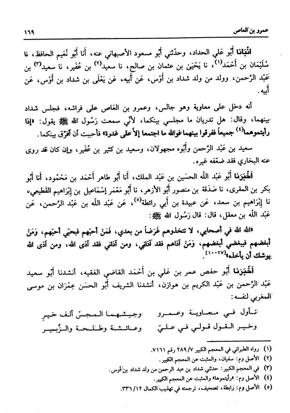 أنبأنا أبو علي الحداد وحدثني أبو مسعود الأصبهاني عنه أنا أبو نعيم الحافظ نا سليمان بن أحمد (1) نا يحيى بن عثمان بن صالح نا سعيد (2) بن عفير نا سعيد (3) بن عبد الرحمن وولد من ولد شداد بن أوس عن أبيه عن يعلى بن شداد بن أوس عن أبيه أنه دخل على معاوية وهو جالس وعمرو بن العاص على فراشه فجلس شداد بينهما وقال هل تدريان ما مجلسي بينكما لأني سمعت رسول الله (صلى الله عليه وسلم) يقول إذا رأيتموهما (4) جميعا ففرقوا بينهما فوالله ما اجتمعا إلا على غدرة فأحببت أن أفرق بينكما سعيد بن عبد الرحمن وأبوه مجهولان وسعيد بن كثير بن عفير وإن كان قد روى عنه البخاري فقد ضعفه غيره أخبرنا أبو عبد الله الحسين بن عبد الملك أنا أبو طاهر أحمد بن محمود أنا أبو بكر بن المقرى نا صدقة بن منصور أبو الأزهر نا أبو معمر إسماعيل بن إبراهيم القطيعي نا إبراهيم بن سعد عن عبيدة بن أبي رائطة (5) عن عبد الله بن عبد الرحمن عن عبد الله بن معقل قال قال رسول الله (صلى الله عليه وسلم) الله الله في أصحابي لا تتخذوهم غرضا من بعدي فمن أحبهم فبحبي أحبهم ومن أبغضهم فببغضي أبغضهم ومن آذاهم فقد آذاني ومن آذاني فقد آذى الله ومن آذى الله يوشك أن يأخذه