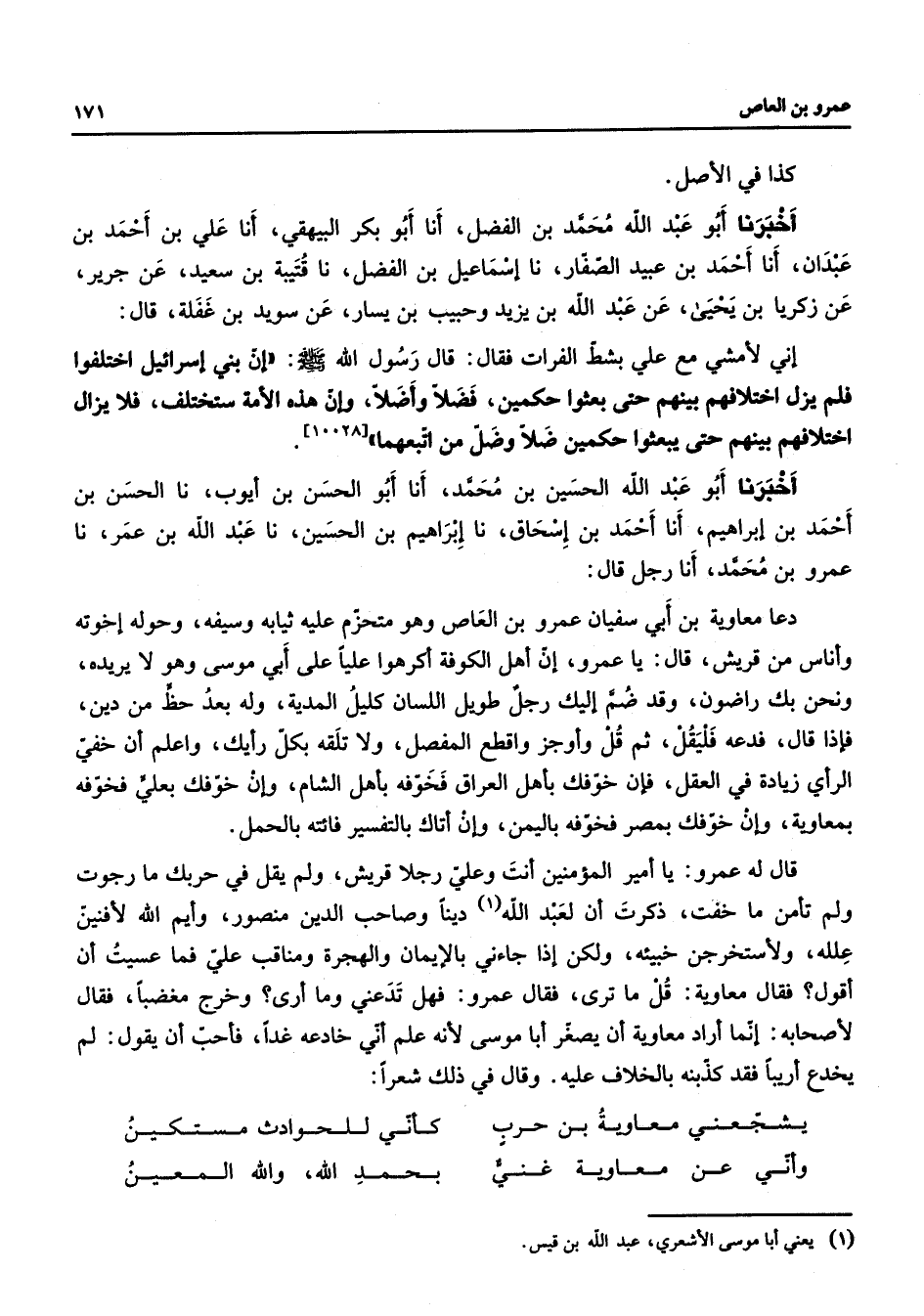 [10028] أخبرنا أبو عبد الله الحسين بن محمد أنا أبو الحسن بن أيوب نا الحسن بن أحمد بن إبراهيم أنا أحمد بن إسحاق نا إبراهيم بن الحسين نا عبد الله بن عمر نا عمرو بن محمد أنا رجل قال دعا معاوية بن أبي سفيان عمرو بن العاص وهو متحزم عليه ثيابه وسيفه وحوله إخوته وأناس قريش قال يا عمرو إن أهل الكوفة أكرهوا عليا على أبي موسى وهو لا يريده ونحن بك راضون وقد ضم إليك رجل طويل اللسان كليل المدية وله بعد حظ من دين فإذا قال فدعه فليقل ثم قل وأوجز واقطع المفصل ولا تلقه بكل رأيك واعلم أن خفي الرأي زيادة في العقل فإن خوفك بأهل العراق فخوفه بأهل الشام وإن خوفك بعلي فخوفه بمعاوية وإن خوفك بمصر فخوفه باليمن وإن أتاك بالتفسير فائته بالحمل قال له عمرو يا أمير المؤمنين أنت وعلي رجلا قريش ولم يقل في حربك ما رجوت ولم تأمن ما خفت ذكرت أن لعبد الله (1) دينا وصاحب الدين منصور وأيم الله لأفنين علله ولأستخرجن خبيئه ولكن إذا جاءني بالإيمان والهجرة ومناقب علي فما عسيت أن أقول فقال معاوية قل ما ترى فقال عمرو فهل تدعني وما أرى وخرج مغضبا فقال لأصحابه إنما أراد معاوية أن يصغر أبا موسى لأنه علم أني خادعه غدا فأحب أن يقول لم يخدع أريبا فقد كذبنه بالخلاف عليه وقال في ذلك شعرا * يشجعني معاوية بن حرب * كأني للحوادث مستكين وأني عن معاوية غني * بحمد الله والله المعين