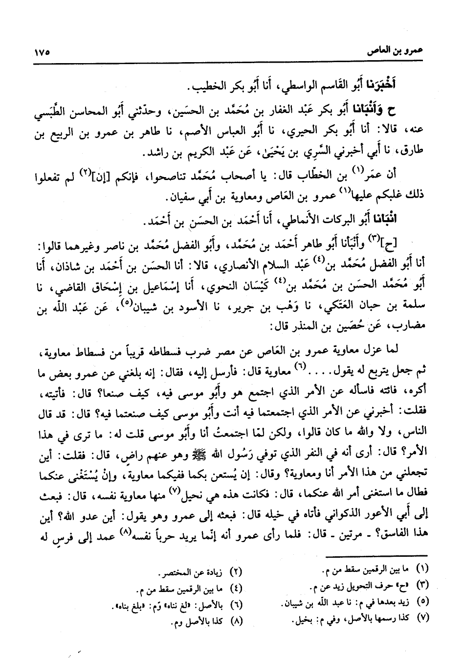 أخبرنا أبو القاسم الواسطي أنا أبو بكر الخطيب ح وأنبأنا أبو بكر عبد الغفار بن محمد بن الحسين وحدثني أبو المحاسن الطبسي عنه قالا أنا أبو بكر الحيري نا أبو العباس الأصم نا طاهر بن عمرو بن الربيع بن طارق نا أبي أخبرني السري بن يحيى عن عبد الكريم بن راشد أن عمر (1) بن الخطاب قال يا أصحاب محمد تناصحوا فإنكم (2) إن لم تفعلوا ذلك غلبكم عليها (1) عمرو بن العاص ومعاوية بن أبي سفيان أنبأنا أبو البركات الأنماطي أنا أحمد بن الحسن بن أحمد ح (3) وأنبأنا أبو طاهر أحمد بن محمد وأبو الفضل محمد بن ناصر وغيرهما قالوا أنا أبو الفضل محمد بن عبد السلام الأنصاري قالا أنا الحسن بن أحمد بن شاذان أنا أبو محمد الحسن بن محمد بن (4) كيسان النحوي أنا إسماعيل بن إسحاق القاضي نا سليمة بن حبان العتكي نا وهب بن جرير نا الأسود بن شيبان (5) عن عبد الله بن مضارب عن حصين بن المنذر قال لما عزل معاوية عمرو بن العاص عن مصر ضرب فسطاطه قريبا من فسطاط معاوية ثم جعل يتربع له يقول