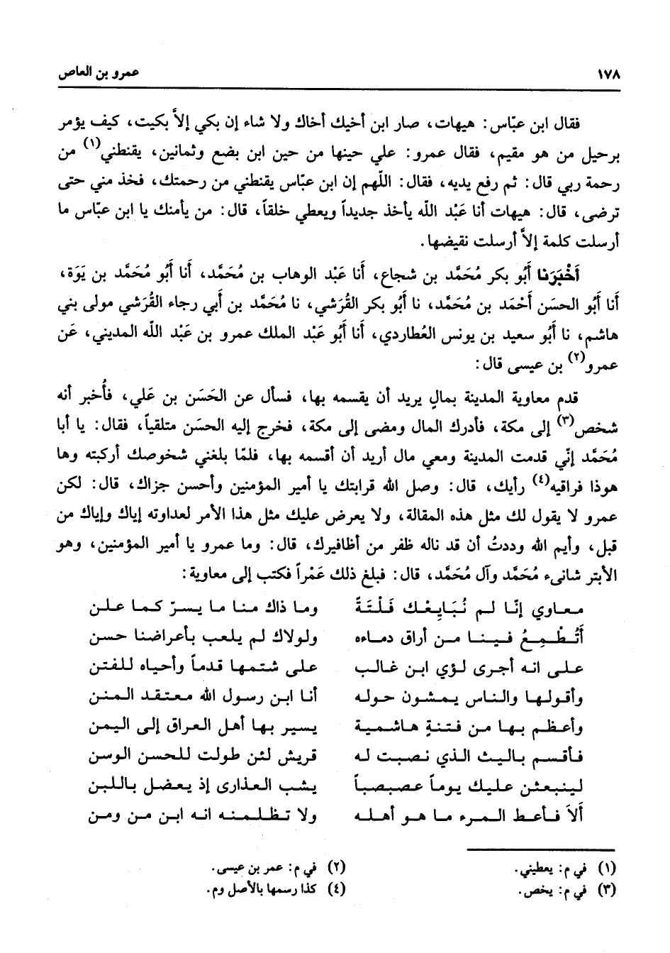 فقال ابن عباس: هيهات صار ابن أخيك أخاك ولا شاء إن بكي إلا بكيت كيف يؤمر برحيل من هو مقيم فقال عمرو علي حينها من حين ابن بضع وثمانين يقنطني (1) من رحمة ربي قال قم رفع يديه فقال اللهم إن ابن عباس يقنطني من رحمتك فخذ مني حتى ترضى قال هيهات أنا عبد الله يأخذ جديدا ويعطي خلقا قال من يأمنك يا ابن عباس ما أرسلت كلمة إلا أرسلت نقيضها أخبرنا أبو بكر محمد بن شجاع أنا عبد الوهاب بن محمد أنا أبو محمد بن يوة أنا أبو الحسن أحمد بن محمد نا أبو بكر القرشي نا محمد بن أبي رجاء القرشي مولى بني هاشم نا أبو سعيد بن يونس العطاردي أنا أبو عبد الملك عمرو بن عبد الله المديني عن عمرو (2) بن عيسى قال قدم معاوية المدينة بمال يريد أن يقسمه بها فسأل عن الحسن بن علي فأخبر أنه شخص (3) إلى مكة فأدرك المال ومضى إلى مكة فخرج إليه الحسن متلقيا فقال يا أبا محمد إني قدمت المدينة ومعي مال أريد أن أقسمه بها فلما بلغني شخوصك أركبته وها هوذا فراقيه (4) رأيك قال وصل الله قرابتك يا أمير المؤمنين وأحسن جزاك قال لكن عمرو لا يقول لك مثل هذه المقالة ولا يعرض عليك مثل هذا الأمر لعداوته إياك وإياك من قبل وأيم الله وددت أن قد ناله ظفر من أظافيرك قال وما عمرو يا أمير المؤمنين وهو الأبتر شانئ محمد وآل محمد قال فبلغ ذلك عمرا فكتب إلى معاوية * معاوي إنا لم نبايعك فلتة * وما ذاك منا ما يسر كما علن أتطمع فينا من أراق دماءه * ولولاك لم يلعب بأعراضنا حسن على أنه أجرى لؤي ابن غالب * على شتمها قدما وأحياه للفتن وأقولها والناس يمشون حوله * أنا ابن رسول الله معتقد المنن وأعظم بها من فتنة هاشمية * يسير بها أهل العراق إلى اليمن فأقسم باليث الذي نصبت له * قريش لئن طولت للحسن الوسن لينبعثن عليك يوما عصبصبا * يشب العذارى إذا يعضل باللبن ألا فأعط المرء ما هو أهله * ولا تظلمنه انه ابن من ومن *