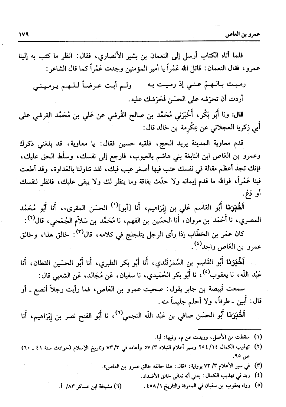 فلما أتاه الكتاب أرسل إلى النعمان بن بشير الأنصاري فقال انظر ما كتب به إلينا عمرو فقال النعمان قاتل الله عمرا يا أمير المؤمنين وجدت عمرا كما قال الشاعر * رميت بالهم عني إذ رميت به * ولم أبت عرضا للهم يرميني * أردت أن تحرشه على الحسن فحرشك عليه قال ونا أبو بكر أخبرني محمد بن صالح القرشي عن علي بن محمد القرشي على أبي زكريا العجلاني عن عكرمة بن خالد قال قدم معاوية المدينة يريد الحج فلقيه حسين فقال يا معاوية قد بلغني ذكرك وعمرو بن العاص ابن النابغة بني هاشم بالعيوب فارجع إلى نفسك وسلط الحق عليك فإنك تجد أعظم مقالة في نفسك عتب فيها أصغر عيب فيك لقد تناولنا بالعداوة وقد أطعت فينا عمرا فوالله ما قدم إيمانه ولا حدث بفاقة وما ينظر لك ولا يبقى عليك فانظر لنفسك أو دع أخبرنا أبو القاسم علي بن إبراهيم أنا أبو (1) الحسن المقرئ أنا أبو محمد المصري نا أحمد بن مروان أنا الحسين بن الفهم نا محمد بن سلام الجمحي قال (2) كان عمر بن الخطاب إذا رأى الرجل يتلجلج في كلامه قال (3) خالق هذا وخالق عمرو بن العاص واحد (4) أخبرنا أبو القاسم بن السمرقندي أنا أبو بكر الطبري أنا أبو الحسين القطان أنا عبد الله نا يعقوب (5) نا أبو بكر الحميدي نا سفيان عن مجالد عن الشعبي قال سمعت قبيصة بن جابر يقول صحبت عمرو بن العاص فما رأيت رجلا أنصع أو قال أبين طرفا ولا أحلم جليسا منه أخبرنا أبو الحسن صافي بن عبد الله النجمي (6) نا أبو الفتح نصر بن إبراهيم أنا