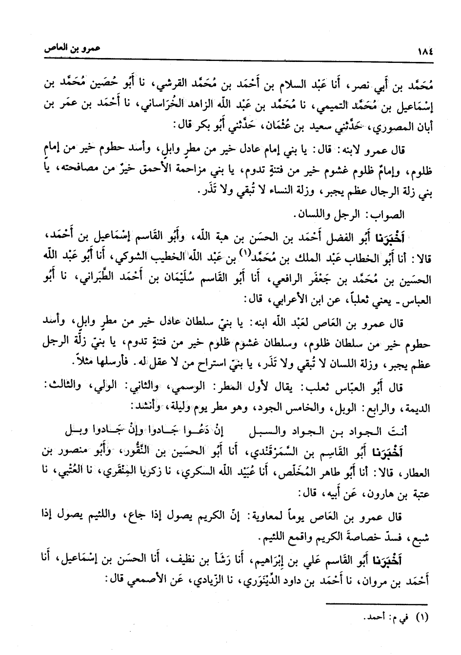 محمد بن أبي نصر أنا عبد السلام بن أحمد بن محمد القرشي نا أبو حصين محمد بن إسماعيل بن محمد التميمي نا محمد بن عبد الله الخراساني نا أحمد بن عمر بن أبان المصوري حدثني سعيد بن عثمان حدثني أبو بكر قال قال عمرو لابنه قال يا بني إمام عادل خير من مطر وابل وأسد حطوم خير من إمام ظلوم وإمام ظلوم غشوم خير من فتنة تدوم يا بني مزاحمة الأحمق خير من مصافحته يا بني زلة الرجال عظم يجبر وزلة النساء لا تبقي ولا تذر الصواب الرجل واللسان أخبرنا أبو الفضل أحمد بن الحسن بن هبة الله وأبو القاسم إسماعيل بن أحمد قالا أنا أبو الخطاب عبد الملك بن محمد (1) بن عبد الله الخطيب الشوكي أنا أبو عبد الله الحسين بن محمد بن جعفر الرافعي أنا أبو القاسم سليمان بن أحمد الطبراني نا أبو العباس يعني ثعلبا عن ابن الأعرابي قال قال عمرو بن العاص لعبد الله ابنه يا بني سلطان عادل خير من مطر وابل وأسد حطوم خير من سلطان ظلوم وسلطان غشوم ظلوم خير من فتنة تدوم يا بني زلة الرجل عظم يجبر وزلة اللسان لا تبقي ولا تذر يا بني استراح من لا عقل له فأرسلها مثلا قال أبو العباس ثعلب يقال لأول المطر الوسمي والثاني الولي والثالث الديمة والرابع الوبل والخامس الجود وهو مطر يوم وليلة وأنشد * أنت الجواد بن الجواد والسبل * إن دعوا جادوا وإن جادوا وبل * أخبرنا أبو القاسم بن السمرقندي أنا أبو الحسين بن النقور وأبو منصور بن العطار قالا أنا أبو طاهر المخلص أنا عبيد الله السكري نا زكريا المنقري نا العتبي نا عتبة بن هارون عن أبيه قال قال عمرو بن العاص يوما لمعاوية إن الكريم يصول إذا جاع واللئيم يصول إذا شبع فسد خصاصة الكريم واقمع اللئيم أخبرنا أبو القاسم علي بن إبراهيم أنا رشأبن نظيف أنا الحسن بن إسماعيل أنا أحمد بن مروان نا أحمد بن داود الدينوري نا الزيادي عن الأصمعي قال
