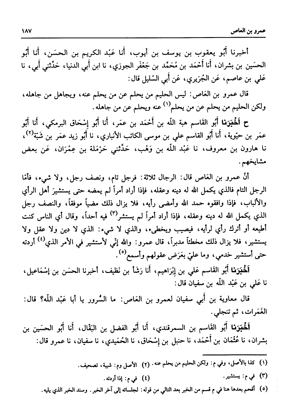 أخبرنا أبو يعقوب بن يوسف بن أيوب أنا عبد الكريم بن الحسن أنا أبو الحسين بن بشران أنا أحمد بن محمد بن جعفر الجوزي نا ابن أبي الدنيا حدثني أبي نا علي بن عاصم عن الجريري عن أبي السليل قال قال عمرو بن العاص ليس الحليم من يحلم عن من يحلم عنه ويجاهل من جاهله ولكن الحليم من يحلم عن من يحلم (1) عنه ويحلم من جاهله ح أخبرنا أبو القاسم هبة الله بن أحمد بن عمر أنا أبو إسحاق البرمكي أنا أبو عمر بن حيوية أنا أبو القاسم علي بن موسى الكاتب الأنباري نا أبو زيد عمر بن شبة (2) نا هارون بن معروف نا عبد الله بن وهب حدثني حرملة بن عمران عن بعض مشايخهم أن عمرو بن العاص قال الرجال ثلاثة فرجل تام ونصف رجل ولا شئ فأما الرجل التام فالذي يكمل الله له دينه وعقله فإذا أراد أمرا لم يمضه حتى يستشير أهل الرأي والألباب فإذا وافقوه حمد الله وأمضى رأيه فلا يزال ذلك مضيا موفقا والنصف رجل الذي يكمل الله له دينه وعقله فإذا أراد أمرا لم يستشر (3) فيه أحدا وقال أي الناس كنت أطيعه أو أترك رأي لرأيه فيصيب ويخطئ والذي لا شئ الذي لا دين ولا عقل ولا يستشير فلا يزال ذلك مخطئا مدبرا قال عمرو والله إني لأستشير في الأمر الذي (4) أردته حتى أستشير خدمي وما علي بعرض عقولهم وأسمع (5) أخبرنا أبو القاسم علي بن إبراهيم أنا رشأ بن نظيف أخبرنا الحسن بن إسماعيل نا علي بن عبد الله بن سفيان قال قال معاوية بن أبي سفيان لعمرو بن العاص ما السرور يا أبا عبد الله قال الغمرات ثم تنجلي أخبرنا أبو القاسم بن السمرقندي أنا أبو الفضل بن البقال أنا أبو الحسين بن بشران نا عثمان بن أحمد نا حنبل بن إسحاق نا الحميدي نا سفيان نا عمرو قال