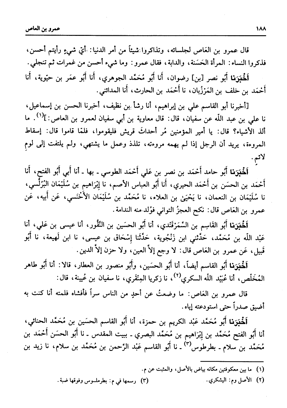 قال عمرو بن العاص لجلسائه وتذاكروا شيئا من أمر الدنيا أي شئ رأيتم أحسن فذكروا النساء المرأة الحسنة والدابة فقال عمرو وما شئ أحسن من غمرات ثم تنجلي أخبرنا أبو نصر بن رضوان أنا أبو محمد الجوهري أنا أبو عمر بن حيوية أنا أحمد بن خلف بن المرزبان نا أحمد بن الحارث أنا المدائني أخبرنا أبو القاسم علي بن إبراهيم أنا رشأ بن نظيف أخبرنا الحسن بن إسماعيل نا علي بن عبد الله عن سفيان قال قال معاوية بن أبي سفيان لعمرو بن العاص (1) ما ألذ الأشياء قال يا أمير المؤمنين مر أحداث قريش فليقوموا فلما قاموا قال إسقاط المروءة يريد أن الرجل إذا لم يهمه مروءته تلذذ وعمل ما يشتهي ولم يلتفت إلى لوم لائم أخبرنا أبو حامد أحمد بن نصر بن علي أحمد الطوسي بها أنا أبي أبو الفتح أنا أحمد بن الحسن بن أحمد الحيري أنا أبو العباس الأصم نا إبراهيم بن سليمان البرلسي نا سليمان بن النعمان نا يحيى بن العلاء نا محمد بن سليمان الأخنسي عن أبيه عن عمرو بن العاص قال نكح العجز التواني فولد منه الندامة أخبرنا أبو القاسم بن السمرقندي أنا أبو الحسين بن النقور أنا عيسى بن علي أنا عبد الله بن محمد حدثني ابن زنجوية حدثنا إسحاق بن عيسى نا ابن لهيعة نا أبو قبيل عن عمرو بن العاص قال لا وجع إلا العين ولا حزن إلى الدين أخبرنا أبو القاسم أيضا أنا أبو الحسين وأبو منصور بن العطار قالا أنا أبو طاهر المخلص أنا عبد الله السكري (2) نا زكريا المنقري نا سفيان بن عيينة قال قال عمرو بن العاص ما وضعت عن أحد من الناس سرا فأفشاه فلمته أنا كنت به أضيق صدرا حتى استودعته إياه أخبرنا أبو محمد عبد الكريم بن حمزة أنا أبو القاسم الحسين بن محمد الحنائي أنا أبو الفتح محمد بن إبراهيم بن محمد البصري ببيت المقدس نا أبو الحسن أحمد بن محمد بن سلام بطرطوس (3) نا أبو القاسم عبد الرحمن بن محمد بن سلام نا زيد بن