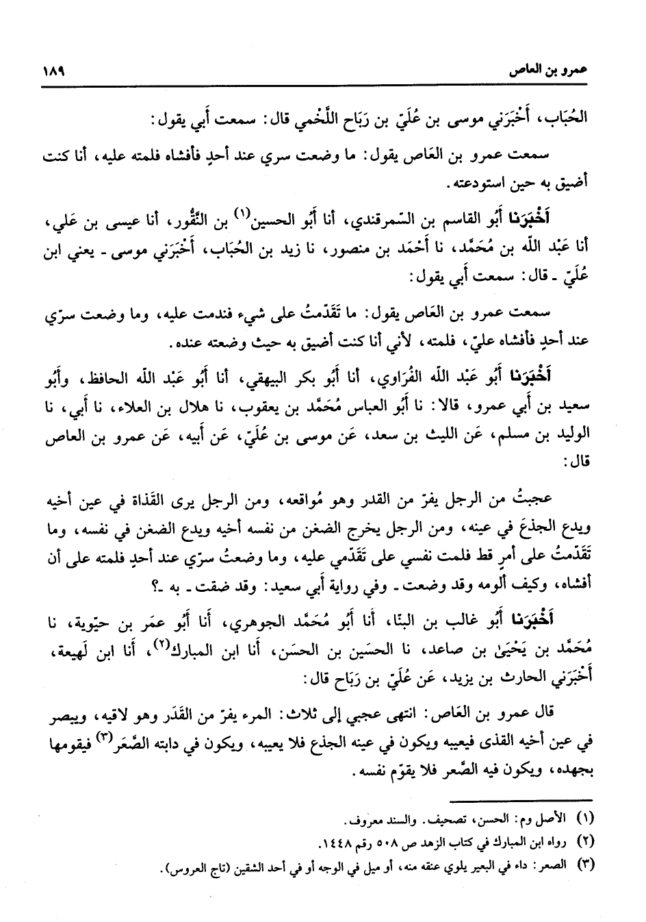 الحباب أخبرني موسى بن علي بن رباح اللخمي قال سمعت أبي يقول سمعت عمرو بن العاص يقول ما وضعت سري عند أحد فأفشاه فلمته عليه أنا كنت أضيق به حين استودعته أخبرنا أبو القاسم بن السمرقندي أنا أبو الحسين (1) بن النقور أنا عيسى بن علي أنا عبد الله بن محمد نا أحمد بن منصور نا زيد بن الحباب أخبرني موسى يعني ابن علي قال سمعت أبي يقول سمعت عمرو بن العاص يقول ما تقدمت على شئ فندمت عليه وما وضعت سري عند أحد فأفشاه علي فلمته لأني أنا كنت أضيق به حيث وضعته عنده أخبرنا أبو عبد الله الفراوي أنا أبو بكر البيهقي أنا أبو عبد الله الحافظ وأبو سعيد بن أبي عمرو قالا نا أبو العباس محمد بن يعقوب نا هلال بن العلاء نا أبي نا الوليد بن مسلم عن الليث بن سعد عن موسى بن علي عن أبيه عن عمرو بن العاص قال عجبت من الرجل يفر من القدر وهو مواقعه ومن الرجل يرى القذاة في عين أخيه ويدع الجذع في عينه ومن الرجل يخرج الضغن من نفسه أخره ويدع الضغن في نفسه وما تقدمت على أمر قط فلمت نفسي على تقدمي عليه وما وضعت سري عند أحد فلمته على أن أفشاه وكيف ألومه وقد وضعت وفي رواية أبي سعيد وقد ضقت به أخبرنا أبو غالب بن البنا أنا أبو محمد الجوهري أنا أبو عمر بن حيوية نا محمد بن يحيى بن صاعد نا الحسين بن الحسن أنا ابن المبارك (2) أنا ابن لهيعة أخبرني الحارث بن يزيد عن علي بن رباح قال قال عمرو بن العاص انتهى عجبي إلى ثلاث المرء يفر من القدر وهو لاقيه ويبصر في عين أخيه القذى فيعيبه ويكون في عينه الجذع فلا يعيبه ويكون في دابته الصعر (3) فيقومها بجهده ويكون فيه الصعر فلا يقوم نفسه