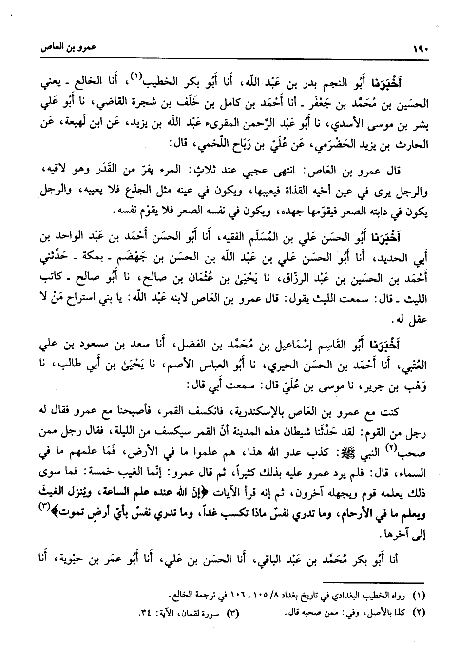 أخبرنا أبو النجم بدر بن عبد الله أنا أبو بكر الخطيب أنا (1) الخالع يعني الحسين بن محمد بن جعفر أنا أحمد بن كامل بن خلف بن شجرة القاضي نا أبو علي بشر بن موسى الأسدي نا أبو عبد الرحمن المقرئ عبد الله بن يزيد عن ابن لهيعة عن الحارث بن يزيد الحضرمي عن علي بن رباح اللخمي قال قال عمرو بن العاص انتهى عجبي عند ثلاث المرء يفر من القدر وهو لاقيه والرجل يرى في عين أخيه القذاة فيعيبها ويكون في عينه مثل الجذع فلا يعيبه والرجل يكون في دابته الصعر فيقومها جهده ويكون في نفسه الصعر فلا يقوم نفسه أخبرنا أبو الحسن علي بن المسلم الفقيه أنا أبو الحسن أحمد بن عبد الواحد بن أبي الحديد أنا أبو الحسن علي بن عبد الله بن الحسن بن جهضم بمكة حدثني أحمد بن الحسين بن عبد الرزاق نا يحيى بن عثمان بن صالح نا أبو صالح كاتب الليث قال سمعت الليث يقول قال عمرو بن العاص لابنه عبد الله يا بني استراح من لا عقل له أخبرنا أبو القاسم إسماعيل بن محمد بن الفضل أنا سعد بن مسعود بن علي العتبي أنا أحمد بن الحسن الحيري نا أبو العباس الأصم نا يحيى بن أبي طالب نا وهب بن جرير نا موسى بن علي قال سمعت أبي قال كنت مع عمرو بن العاق بالإسكندرية فانكسف القمر فأصبحنا مع عمرو فقال له رجل من القوم لقد حدثنا شيطان هذه المدينة أن القمر سيكسف من الليلة فقال رجل ممن صحب (2) النبي (صلى الله عليه وسلم) كذب عدو الله هذا هم علموا ما في الأرض فما علمهم ما في السماء قال فلم يرد عمرو عليه بذلك كثيرا ثم قال عمرو إنما الغيب خمسة فما سوى ذلك يعلمه قوم ويجهله آخرون ثم إنه قرآ الآيات " إن الله عنده علم الساعة وينزل الغيث ويعلم ما في الأرحام وما تدري نفس ماذا تكسب غدا وما تدري نفس بأي أرض تموت " (2) إلى آخرها أنا أبو بكر محمد بن عبد الباقي أنا الحسن بن علي أنا أبو عمر بن حيوية أنا
