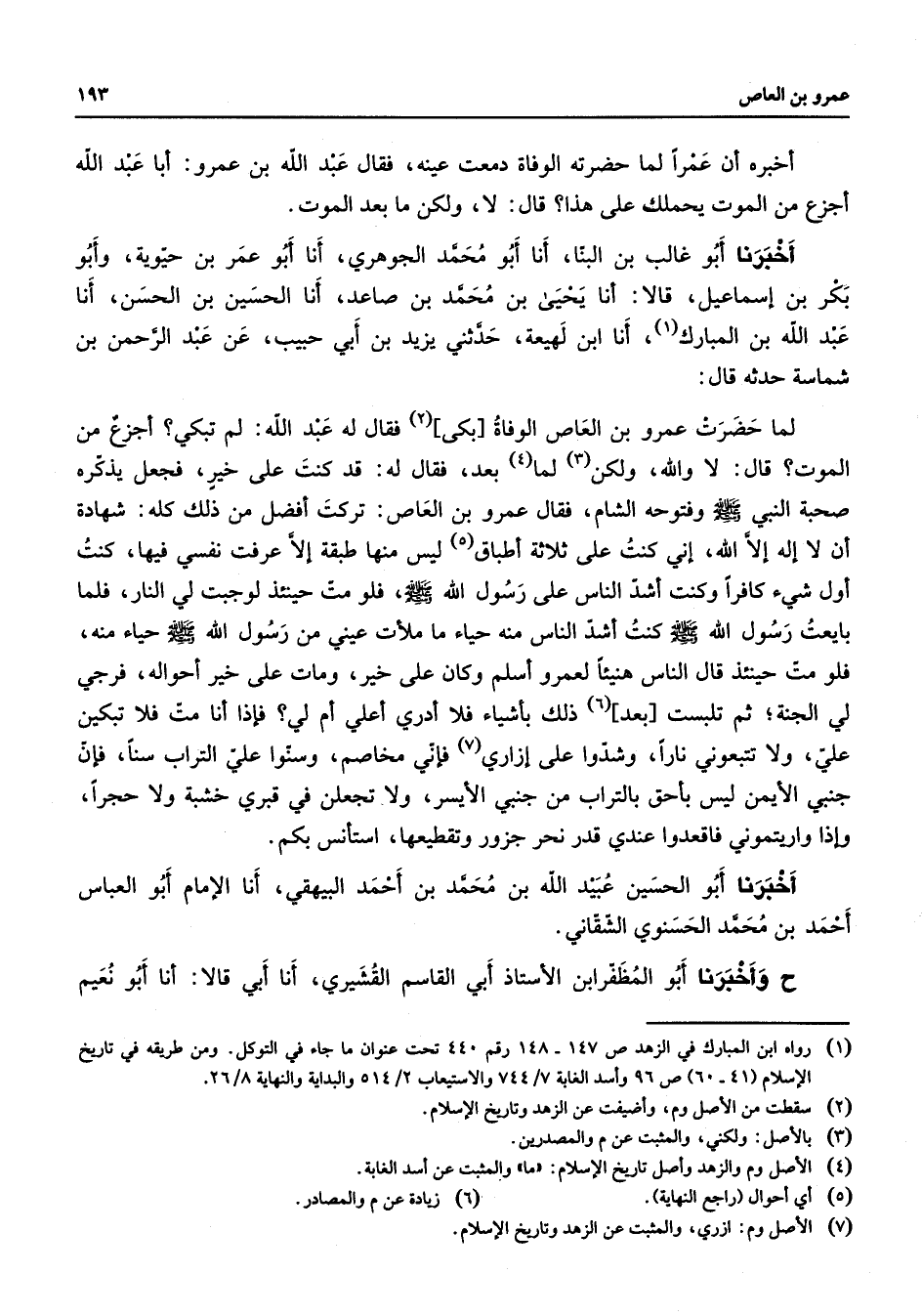 أخبره أن عمرا لما حضرته الوفاة دمعت عينه فقال عبد الله بن عمرو أبا عبد الله أجزع من الموت يحملك على هذا قال لا ولكن ما بعد الموت أخبرنا أبو غالب بن البنا أنا أبو محمد الجوهري أنا أبو عمر بن حيوية وأبو بكر بن إسماعيل قالا أنا يحيى بن محمد بن صاعد أنا الحسين بن الحسن أنا عبد الله بن المبارك (1) أنا ابن لهيعة حدثني يزيد بن أبي حبيب عن عبد الرحمن بن شماسة حدثه قال لما حضرت عمرو بن العاص الوفاة بكى (2) فقال له عبد الله لم تبكي أجزع من الموت قال لا والله ولكن (3) لما (4) بعد فقال له قد كنت على خير فجعل يذكره صحبة النبي (صلى الله عليه وسلم) وفتوحه الشام فقال عمرو بن العاص تركت أفضل من ذلك كله شهادة أن لا إله إلا الله إني كنت على ثلاثة أطباق (5) ليس منها طبقة إلا عرفت نفسي فيها كنت أول شئ كافرا وكنت أشد الناس على رسول الله (صلى الله عليه وسلم) فلو مت حينئذ لوجبت لي النار فلما بايعت رسول الله (صلى الله عليه وسلم) كنت أشد الناس منه حياء ما ملأت عيني من رسول الله (صلى الله عليه وسلم) حياء منه فلو مت حينئذ قال الناس هنيئا لعمرو أسلم وكان على خير ومات على خير أحواله فرجي لي الجنة ثم تلبست بعد (6) ذلك بأشياء فلا أدري أعلي أم لي فإذا أنا مت فلا تبكين علي ولا تتبعوني نارا وشدوا على إزاري (7) فإني مخاصم وسنوا علي التراب سنا فإن جنبي الأيمن ليس بأحق بالتراب من جنبي الأيسر ولا تجعلن في قبري خشبة ولا حجرا وإذا واريتموني فاقعدوا عندي قدر نحر جزور وتقطيعها استأنس بكم أخبرنا أبو الحسين عبيد الله بن محمد بن أحمد البيهقي أنا الإمام أبو العباس أحمد بن محمد الحسنوي الشقاني ح وأخبرنا أبو المظفر ابن الأستاذ أبي القاسم القشيري أنا أبي قالا أنا أبو نعيم