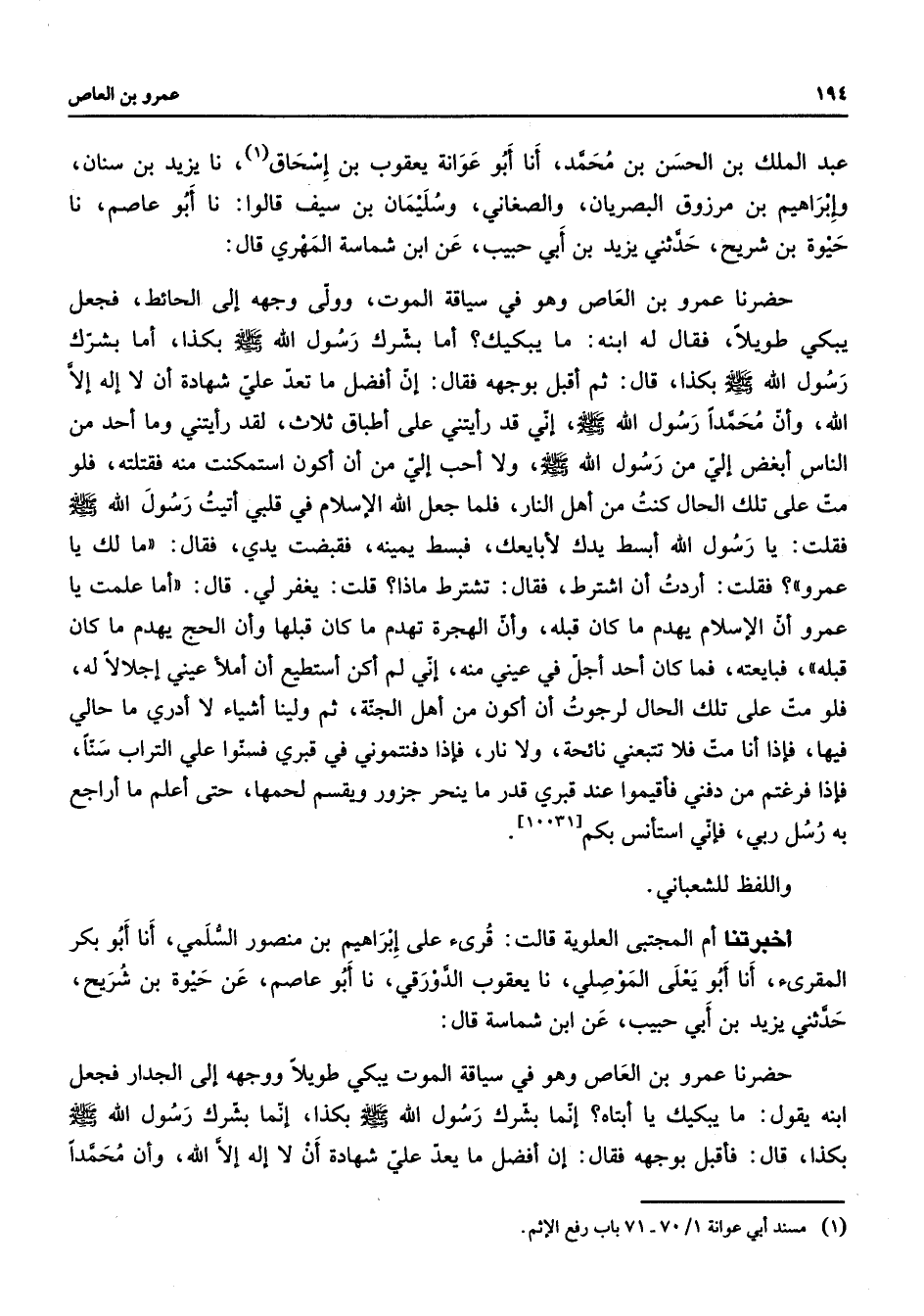 عبد الملك بن الحسن بن محمد أنا أبو عوانة يعقوب بن إسحاق (1) نا يزيد بن سنان وإبراهيم بن مرزوق البصريان والصغاني وسليمان بن سيف قالوا نا أبو عاصم نا حيوية بن شريح حدثني يزيد بن أبي حبيب عن ابن شماسة المهري قال حضرنا عمرو بن العاص وهو في سياقة الموت وولى وجهه إلى الحائط فجعل يبكي طويلا فقال له ابنه ما يبكيك أما بشرك رسول الله (صلى الله عليه وسلم) بكذا أما بشرك رسول الله (صلى الله عليه وسلم) بكذا قال ثم أقبل بوجهه فقال إن أفضل ما تعد علي شهادة أن لا إله إلا الله وأن محمدا رسول الله (صلى الله عليه وسلم) إني قد رأيتني على أطباق ثلاث لقد رأيتني وما أحد من الناس أبغض إلي من رسول الله (صلى الله عليه وسلم) ولا أحب إلي من أن أكون استمكنت منه فقتلته فلو مت على تلك الحال كنت من أهل النار فلما جعل الله الإسلام في قلبي أتيت رسول الله (صلى الله عليه وسلم) فقلت يا رسول الله أبسط يدك لأبايعك فبسط يمينه فقبضت يدي فقالت ما لك يا عمرو فقلت أردت أن اشترط فقال تشترط ماذا قلت يغفر لي قال أما علمت يا عمرو أن الإسلام يهدم ما كان قبله وأن الهجرة تهدم ما كان قبلها وأن الحج يهدم ما كان قبله فبايعته فما كان أحدا أجل في عيني منه إني لم أكن أستطع أن أملأ عيني إجلالا له فلو مت على تلك الحال لرجوت أن أكون من أهل الجنة ثم ولينا أشياء لا أدري ما حالي فيها فإذا أنا مت فلا تتبعني نائحة ولا نار فإذا دفنتموني في قبري فسنوا علي التراب سنا فإذا فرغتم من دفني فأقيموا عند قبري قدر ما ينحر جزور ويقسم لحمها حتى أعلم ما أراجع به رسل ربي فإني استأنس بكم