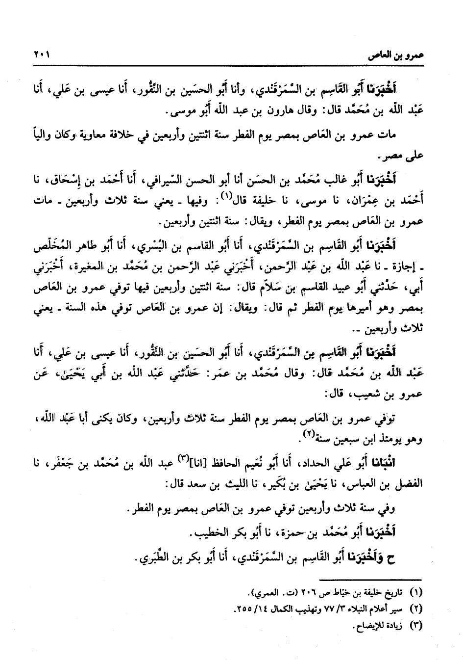 أخبرنا أبو القاسم بن السمرقندي وأنا أبو الحسين بن النقور أنا عيسى بن علي أنا عبد الله بن محمد قال وقال هارون بن عبد الله أبو موسى مات عمرو بن العاص بمصر يوم الفطر سنة اثنتين وأربعين في خلافة معاوية وكان واليا على مصر أخبرنا أبو غالب محمد بن الحسن أنا أبو الحسين السيرافي أنا أحمد بن إسحاق نا أحمد بن عمران نا موسى نا خليفة قال (1) وفيها يعني سنة ثلاث وأربعين مات عمرو بن العاص بمصر يوم الفطر ويقال سنة اثنتين وأربعين أخبرنا أبو القاسم بن السمرقندي أنا أبو القاسم بن البسري أنا أبو طاهر المخلص إجازة نا عبد الله بن عبد الرحمن أخبرني عبد الرحمن بن محمد بن المغيرة أخبرني أبي حدثني أبو عبيد القاسم بن سلام قال سنة اثنتين وأربعين فيها توفي عمرو بن العاص بمصر وهو أميرها يوم الفطر ثم قال ويقال إن عمرو بن العاص توفي هذه السنة يعني ثلاث وأربعين أخبرنا أبو القاسم بن السمرقندي أنا أبو الحسين بن النقور أنا عيسى بن علي أنا عبد الله بن محمد قال وقال محمد بن عمر حدثني عبد الله بن أبي يحيى عن عمرو بن شعيب قال توفي عمرو بن العاص بمصر يوم الفطر سنة ثلاث وأربعين وكان يكنى أبا عبد الله وهو يومئذ ابن سبعين سنة (2) أنبأنا أبو علي الحداد أنا أبو نعيم الحافظ أنا (3) عبد الله بن محمد بن جعفر نا الفضل بن العباس نا يحيى بن بكير نا الليث بن سعد قال وفي سنة ثلاث وأربعين توفي عمرو بن العاص بمصر يوم الفطر أخبرنا أبو محمد بن حمزة نا أبو بكر الخطيب ح وأخبرنا أبو القاسم بن السمرقندي أنا أبو بكر بن الطبري