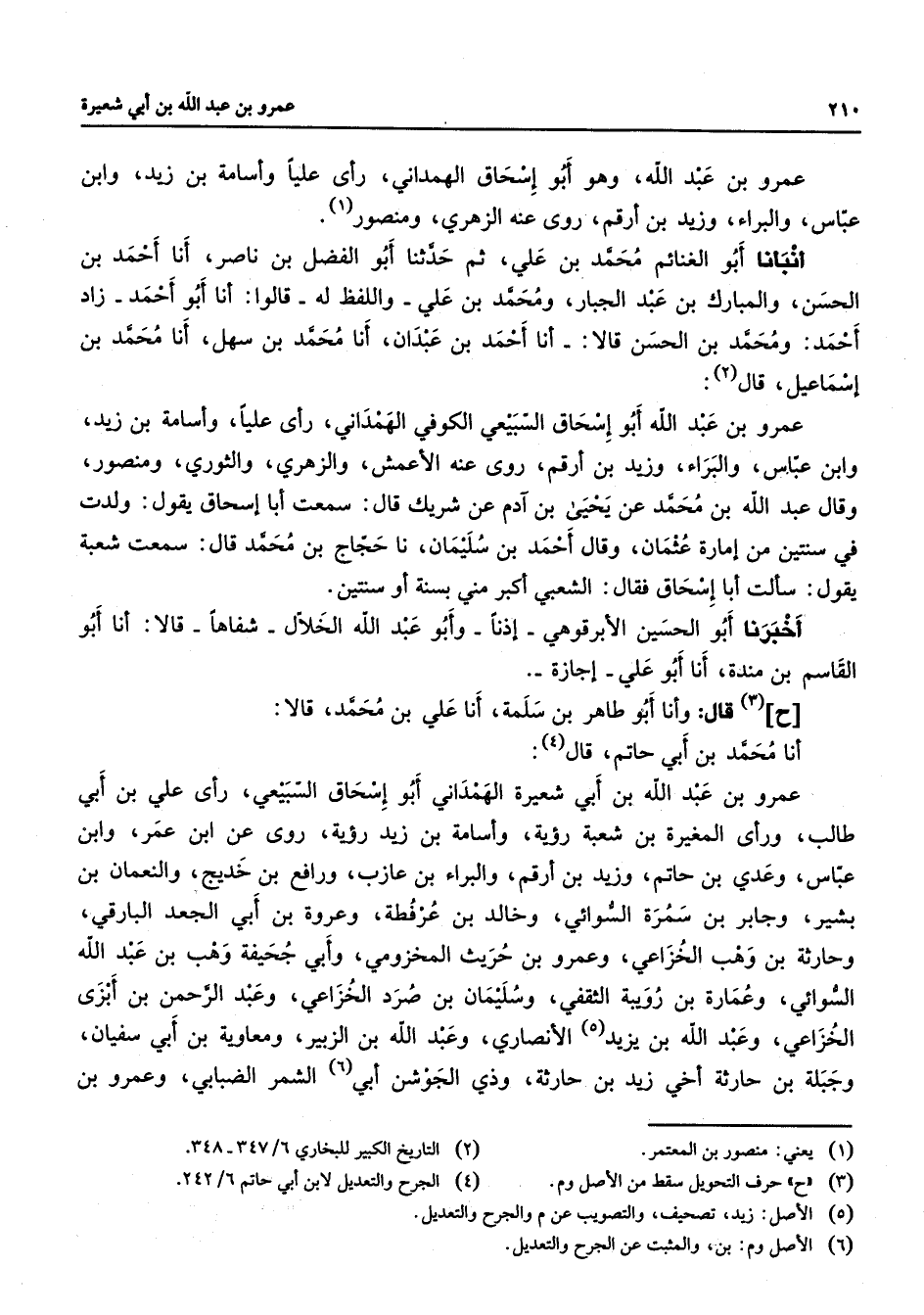 عمرو بن عبد الله وهو أبو إسحاق الهمداني رأى عليا وأسامة بن زيد وابن عباس والبراء وزيد بن أرقم روى عنه الزهري ومنصور (1) أنبأنا أبو الغنائم محمد بن علي ثم حدثنا أبو الفضل بن ناصر أنا أحمد بن الحسن والمبارك بن عبد الجبار ومحمد بن علي واللفظ له قالوا أنا أبو أحمد زاد أحمد ومحمد بن الحسن قالا أنا أحمد بن عبدان أنا محمد بن سهل أنا محمد بن إسماعيل قال (2) عمرو بن عبد الله أبو إسحاق السبيعي الكوفي الهمداني رأى عليا وأسامة بن زيد وابن عباس والبراء وزيد بن أرقم روى عنه الأعمش والزهري والثوري ومنصور وقال عبد الله بن محمد عن يحيى بن آدم عن شريك قال سمعت أبا إسحاق يقول ولدت في سنتين من إمارة عثمان وقال أحمد بن سليمان نا حجاج بن محمد قال سمعت شعبة يقول سألت أبا إسحاق فقال الشعبي أكبر مني بسنة أو سنتين أخبرنا أبو الحسين الأبرقوهي إذنا وأبو عبد الله الخلال شفاها قالا أنا أبو القاسم بن مندة أنا أبو علي إجازة ح (3) قال وأنا أبو طاهر بن سلمة أنا علي بن محمد قالا أنا محمد بن أبي حاتم قال (4) عمرو بن عبد الله بن أبي شعيبة الهمداني أبو إسحاق السبيعي رأى علي بن أبي طالب ورأى المغيرة بن شعبة رؤية وأسامة بن زيد رؤية روى عن ابن عمر وابن عباس وعدي بن حاتم وزيد بن أرقم والبراء بن عازب ورافع بن خديج والنعمان بن بشير وجابر بن سمرة السوائي وخالد بن عرفطة وعروة بن أبي الجعد البارقي وحارثة بن وهب الخزاعي وعمرو بن حريث المخزومي وأبي جحيفة وهب بن عبد الله السوائي وعمارة بن رويبة الثقفي وسليمان بن صرد الخزاعي وعبد الرحمن بن أبزى الخزاعي وعبد الله بن يزيد (5) الأنصاري وعبد الله بن الزبير ومعاوية بن أبي سفيان وجبلة بن حارثة أخي زيد بن حارثة وذي الجوشن أبي (6) الشمر الضبابي وعمرو بن