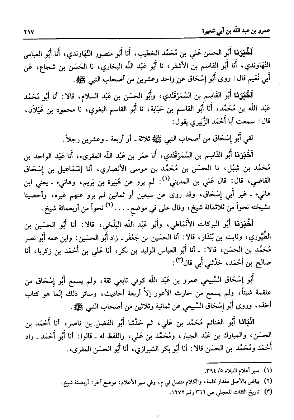 (2) نحوا من أربعمائة شيخ أخبرنا أبو البركات الأنماطي وأبو عبد الله البلخي قالا أنا أبو الحسين بن الطيوري وثابت بن بندار قالا أنا الحسين بن جعفر زاد أبو الحسين وابن عمه أبو نصر محمد بن الحسن قالا أنا أبو العباس الوليد بن بكر أنا علي بن أحمد بن زكريا أنا صالح بن أحمد حدثني أبي قال (3) أبو إسحاق السبيعي عمرو بن عبد الله كوفي تابعي ثقة ولم يسمع أبو إسحاق من علقمة شيئا ولم يسمع من حارث الأعور إلا أربعة أحاديث وسائر ذلك إنما هو كتاب أخذه وروى أبو إسحاق السبيعي عن ثمانية وثلاثين من أصحاب النبي (صلى الله عليه وسلم) أنبأنا أبو الغنائم محمد بن علي ثم حدثنا أبو الفضل بن ناصر أنا أحمد بن الحسن والمبارك بن عبد الجبار ومحمد بن علي واللفظ له قالوا أنا أبو أحمد زاد أحمد ومحمد بن الحسن قالا أنا أبو بكر الشيرازي أنا أبو الحسن المقرئ
