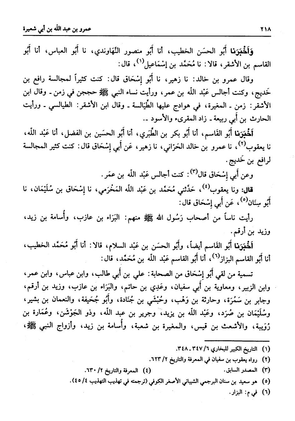 وأخبرنا أبو الحسن الخطيب أنا أبو منصور النهاوندي نا أبو العباس أنا أبو القاسم بن الأشقر قالا نا محمد بن إسماعيل (1) قال وقال عمرو بن خالد نا زهير نا أبو إسحاق قال كنت كثيرا لمجالسة رافع بن خديج وكنت أجالس عبد الله بن عمر ورأيت نساء النبي (صلى الله عليه وسلم) حججن في زمن وقال ابن الأشقر زمن المغيرة في هوادج عليها الطيالسة وقال ابن الأشقر الطيالسي ورأيت الحارث بن أبي ربيعة زاد المقرئ والأسود أخبرنا أبو القاسم أنا أبو بكر بن الطبري أنا أبو الحسين بن الفضل أنا عبد الله نا يعقوب (2) نا عمرو بن خالد الحراني نا زهير عن أبي إسحاق قال كنت كثير المجالسة لرافع بن خديج وعن أبي إسحاق قال (3) كنت أجالس عبد الله بن عمر قال ونا يعقوب (4) حدثني محمد بن عبد الله المخرمي نا إسحاق بن سليمان نا أبو سنان (5) عن أبي إسحاق قال رأيت ناسا من أصحاب رسول الله (صلى الله عليه وسلم) منهم البراء بن عازب وأسامة بن زيد وزيد بن أرقم أخبرنا أبو القاسم أيضا وأبو الحسن بن عبد السلام قالا أنا أبو محمد الخطيب أنا أبو القاسم البزاز (6) أنا أبو القاسم عبد الله بن محمد قال تسمية من لقي أبو إسحاق من الصحابة علي بن أبي طالب وابن عباس وابن عمر وابن الزبير ومعاوية بن أبي سفيان وعدي بن حاتم والبراء بن عازب وزيد بن أرقم وجابر بن سمرة وحارثة بن وهب وحبشي بن جنادة وأبو جحيفة والنعمان بن بشير وسليمان بن صرد وعبد الله بن يزيد وجرير بن عبد الله وذو الجوشن وعمارة بن رويبة والأشعث بن قيس والمغيرة بن شعبة وأسامة بن زيد وأزواج النبي (صلى الله عليه وسلم)