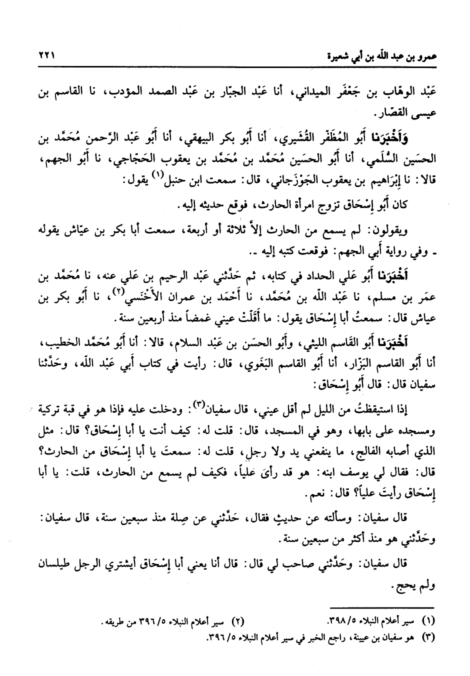 عبد الوهاب بن جعفر الميداني أنا عبد الجبار بن عبد الصمد المؤدب نا القاسم بن عيسى القصار وأخبرنا أبو المظفر القشيري أنا أبو بكر البيهقي أنا أبو عبد الرحمن محمد بن الحسين السلمي أنا أبو الحسين محمد بن محمد بن يعقوب الحجاجي نا أبو الجهم قالا نا إبراهيم بن يعقوب الجوزجاني قال سمعت ابن حنبل (1) يقول كان أبو إسحاق تزوج امرأة الحارث فوقع حديثه إليه ويقولون لم يسمع من الحارث إلا ثلاثة أو أربعة سمعت أبا بكر بن عياش يقوله وفي رواية أبي الجهم فوقعت كتبه إليه أخبرنا أبو علي الحداد في كتابه ثم حدثني عبد الرحيم بن علي عنه نا محمد بن عمر بن مسلم نا عبد الله بن محمد نا أحمد بن عمران الأخنسي (2) نا أبو بكر بن عياش قال سمعت أبا إسحاق يقول ما أقلت عيني غمضا منذ أربعين سنة أخبرنا أبو القاسم الليثي وأبو الحسن بن عبد السلام قالا أنا أبو محمد الخطيب أنا أبو القاسم البزار أنا أبو القاسم البغوي قال رأيت في كتاب أبي عبد الله وحدثنا سفيان قال قال أبو إسحاق إذا استيقظت من الليل لم أقل عين قال سفيان (3) ودخلت عليه فإذا هو في قبة تركية ومسجده على بابها وهو في المسجد قال قلت له كيف أنت يا أبا إسحاق قال مثل الذي أصابه الفالج ما ينفعني يد ولا رجل قلت له سمعت يا أبا إسحاق من الحارث قال فقال لي يوسف ابنه هو قد رأى عليا فكيف لم يسمع من الحارث قلت يا أبا إسحاق رأيت عليا قال نعم قال سفيان وسألته عن حديث فقال حدثني عن صلى منذ سبعين سنة قال سفيان وحدثني هو منذ أكثر من سبعين سنة قال سفيان وحدثني صاحب لي قال قال أنا يعني أبا إسحاق أيشتري الرجل طيلسان ولم يحج