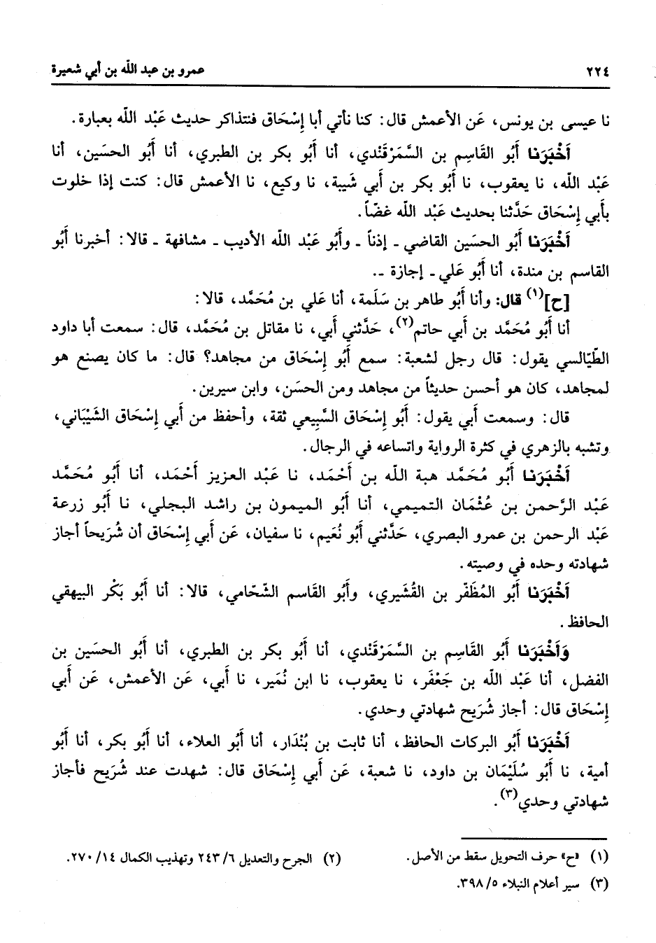 نا عيسى بن يونس عن الأعمش قال كنا نأتي أبا إسحاق فنتذاكر حديث عبد الله بعبارة أخبرنا أبو القاسم بن السمرقندي أنا أبو بكر بن الطبري أنا أبو الحسين أنا عبد الله نا يعقوب نا أبو بكر بن أبي شيبة نا وكيع نا الأعمش قال كنت إذا خلوت بأبي إسحاق حدثنا بحديث عبد الله غضا أخبرنا أبو الحسين القاضي إذنا وأبو عبد الله الأديب مشافهة قالا أخبرنا أبو القاسم بن مندة أنا أبو علي إجازة ح (1) قال وأنا أبو طاهر بن سلمة أنا علي بن محمد قالا أنا أبو محمد بن أبي حاتم (2) حدثني أبي نا مقاتل بن محمد قال سمعت أبا داود الطيالسي يقول قال رجل لشعبة سمع أبو إسحاق من مجاهد قال ما كان يصنع هو لمجاهد كان هو أحسن حديثا من مجاهد ومن الحسن وابن سيرين قال وسمعت أبي يقول أبو إسحاق السبيعي ثقة وأحفظ من أبي إسحاق الشيباني وتشبه بالزهري في كثرة الرواية واتساعه في الرجال أخبرنا أبو محمد هبة الله بن أحمد نا عبد العزيز أحمد أنا أبو محمد عبد الرحمن بن عثمان التميمي أنا أبو الميمون بن راشد البجلي نا أبو زرعة عبد الرحمن بن عمرو البصري حدثني أبو نعيم نا سفيان عن أبي إسحاق أن شريحا أجاز شهادته وحده في وصيته أخبرنا أبو المظفر بن القشيري وأبو القاسم الشحامي قالا أنا أبو بكر البيهقي الحافظ وأخبرنا أبو القاسم بن السمرقندي أنا أبو بكر بن الطبري أنا أبو الحسين بن الفضل أنا عبد الله بن جعفر نا يعقوب نا ابن نمير نا أبي عن الأعمش عن أبي إسحاق قال أجاز شريح شهادتي وحدي أخبرنا أبو البركات الحافظ أنا ثابت بن بندار أنا أبو العلاء أنا أبو بكر أنا أبو أمية نا أبو سليمان بن داود نا شعبة عن أبي إسحاق قال شهدت عند شريح فأجاز شهادتي وحدي (3)
