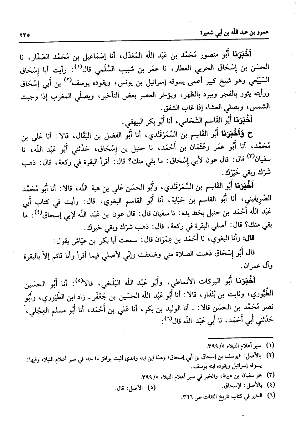 أخبرنا أبو منصور محمد بن عبد الله المعدل أنا إسماعيل بن محمد الصفار نا الحسن بن إسحاق الحربي العطار نا عمر بن شبيب السلمي قال (1) رأيت أبا إسحاق السبيعي وهو شيخ كبير أعمى يسوقه إسرائيل بن يونس ويقوده يوسف (2) بن أبي إسحاق ورأيته يقور بالفجر ويبرد بالظهر ويؤخر العصر بعض التأخير ويصلي المغرب إذا وجبت الشمس ويصلي العشاء إذا غاب الشفق أخبرنا أبو القاسم الشحامي أنا أبو بكر البيهقي ح وأخبرنا أبو القاسم بن السمرقندي أنا أبو الفضل بن البقال قالا أنا علي بن محمد أنا أبو عمر وعثمان بن أحمد نا حنبل بن إسحاق حدثني أبو عبد الله نا سفيان (3) قال قال عون لأبي إسحاق ما بقي منك قال أقرأ البقرة في ركعة قال ذهب شرك وبقي خيرك أخبرنا أبو القاسم بن السمرقندي وأبو الحسن علي بن هبة الله قالا أنا أبو محمد الصريفيني أنا أبو القاسم بن حبابة أنا أبو القاسم البغوي قال رأيت في كتاب أبي عبد الله أحمد بن حنبل بخط يده نا سفيان قال قال عون بن عبد الله لأبي إسحاق (4) ما بقي منك قال أصلي البقرة في ركعة قال ذهب شرك وبقي خيرك قال وأنا البغوي نا أحمد بن عمران قال سمعت أبا بكر بن عياش يقول قال أبو إسحاق ذهبت الصلاة مني وضعفت وإني لأصلي فيما أقرأوأنا قائم إلا بالبقرة وآل عمران أخبرنا أبو البركات الأنماطي وأبو عبد الله البلخي قالا (5) أنا أبو الحسين الطيوري وثابت بن بندار قالا أنا أبو عبد الله الحسين بن جعفر زاد ابن الطيوري وأبو نصر محمد بن الحسن قالا أنا الوليد بن بكر أنا علي بن أحمد أنا أبو مسلم العجلي حدثني أبي احمد نا أبي عبد الله قال (6)