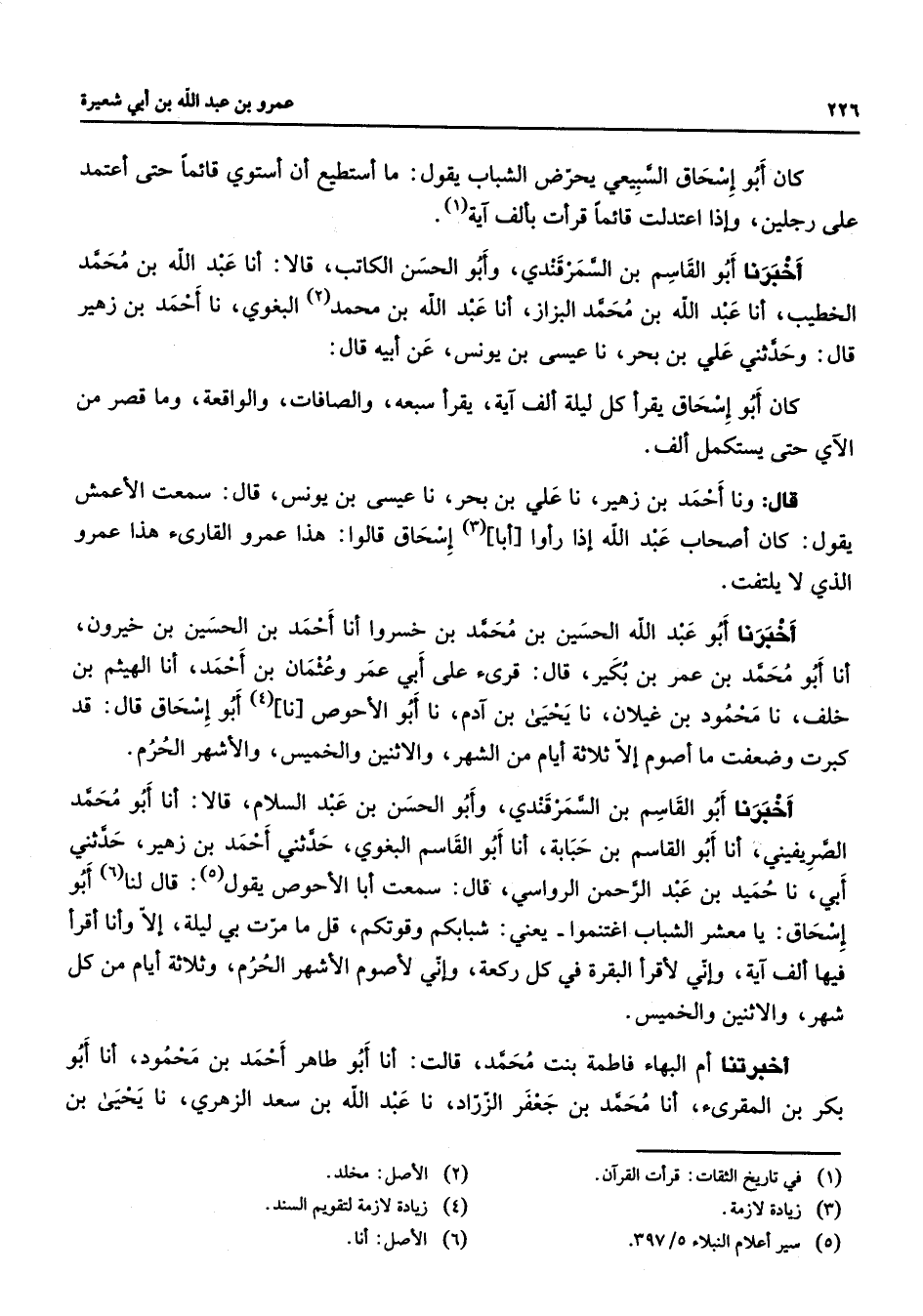 كان أبو إسحاق السبيعي يحرض الشباب يقول ما أستطيع أن أستوي قائما حتى أعتمد على رجلين وإذا اعتدلت قائما قرأت بألف آية (1) أخبرنا أبو القاسم بن السمرقندي وأبو الحسن الكاتب قالا أنا عبد الله بن محمد الخطيب أنا عبد الله بن محمد البزاز أنا عبد الله بن محمد (2) بن البغوي نا أحمد بن زهير قال وحدثني علي بن بحر نا عيسى بن يونس عن أبيه قال كان أبو إسحاق يقرأ كل ليلة ألف آية يقرأ سبعه والصافات والواقعة وما قصر من الآي حتى يستكمل ألف قال ونا أحمد بن زهير نا علي بن بحر نا عيسى بن يونس قال سمعت الأعمش يقول كان أصحاب عبد الله إذا رأوا أبا (3) إسحاق قالوا هذا عمرو القارئ هذا عمرو الذي لا يلتفت أخبرنا أبو عبد الله الحسين بن محمد بن خسروا أنا أحمد بن الحسين بن خيرون أنا أبو محمد بن عمر بن بكير قال قرئ على أبي عمر وعثمان بن أحمد أنا الهيثم بن خلف نا محمود بن غيلان نا يحيى بن آدم نا أبو الأحوص نا (4) أبو إسحاق قال قد كبرت وضعفت ما أصوم إلا ثلاة أيام من الشهر والإثنين والخميس والأشهر الحرم أخبرنا أبو القاسم بن السمرقندي وأبو الحسن بن عبد السلام قالا أنا أبو محمد الصريفيني أنا أبو القاسم بن حبابة أنا أبو القاسم البغوي حدثني أحمد بن زهير حدثني أبي نا حميد بن عبد الرحمن الرواسي قال سمعت أبا الأحوص يقول (5) قال لنا (6) أبو إسحاق يا معشر الشباب اغتنموا يعني شبابكم وقوتكم قل ما مرت بي ليلة إلا وأنا أقرأ فيها ألف آية وإني لأقرأ البقرة في كل ركعة وإني لأصوم الأشهر الحرم وثلاثة أيام من كل شهر والإثنين والخميس أخبرتنا أم البهاء فاطمة بنت محمد قالت أنا أبو طاهر أحمد بن محمود أنا أبو بكر بن المقرئ أنا محمد بن جعفر الزراد نا عبد الله بن سعد الزهري نا يحيى بن
