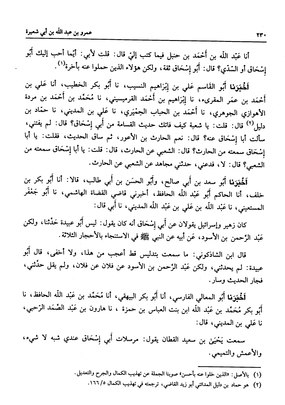 أنا عبد الله بن أحمد بن حنبل فيما كتب إلي قال قلت لأبي أيما أحب إليك أبو إسحاق أو السدي قال أبو إسحاق ثقة ولكن هؤلاء الذين حملوا عنه بأخرة (1) أخبرنا أبو القاسم علي بن إبراهيم النسيب نا أبو بكر الخطيب أنا علي بن أحمد بن عمر المقرئ نا إبراهيم بن أحمد القرميسيني نا محمد بن أحمد بن مردة الأهوازي الجوهري نا أحمد بن الحباب الحميري نا علي بن المديني نا حماد بن دليل (2) قال قلت يا شعبة كيف فاتك حديث القسامة من أبي إسحاق قال لم يفتني سألت أبا إسحاق عنه قال نعم الحارث بن الأعور ثم ساق الحديث فقلت يا أبا إسحاق سمعته من الحارث قال الشعبي عن الحارث قال قلت يا أبا إسحاق سمعته من الشعبي قال لا فدعني حدثني مجاهد عن الشعبي عن الحارث أخبرنا أبو سعيد بن أبي صالح وأبو الحسن بن أبي طالب قالا أنا أبو بكر بن خلف أنا الحاكم أبو عبد الله الحافظ أخبرني قاضي القضاة الهاشمي نا أبو جعفر المستعيني نا عبد الله بن علي بن عبد الله المديني نا أبي قال كان زهير وإسرائيل يقولان عن أبي إسحاق أنه كان يقول ليس أبو عبيدة حدثنا ولكن عبد الرحمن بن الأسود عن أبيه عن النبي (صلى الله عليه وسلم) في الإستنجاء بالأحجار الثلاثة قال ابن الشاذكوني ما سمعت بتدليس قط أعجب من هذا ولا أخفى قال أبو عبيدة لم يحدثني ولكن عبد الرحمن بن الأسود عن فلان عن فلان ولم يقل حدثني فجار الحديث وسار أخبرنا أبو المعالي الفارسي أنا أبو بكر البيهقي أنا محمد بن عبد الله الحافظ نا أبو بكر محمد بن عبد الله ابن بنت العباس بن حمزة نا هارون بن عبد الصمد الرحبي نا علي بن المديني قال سمعت يحيى بن سعيد القطان يقول مرسلان أبي إسحاق عندي شبه لا شئ والأعمش والتميمي